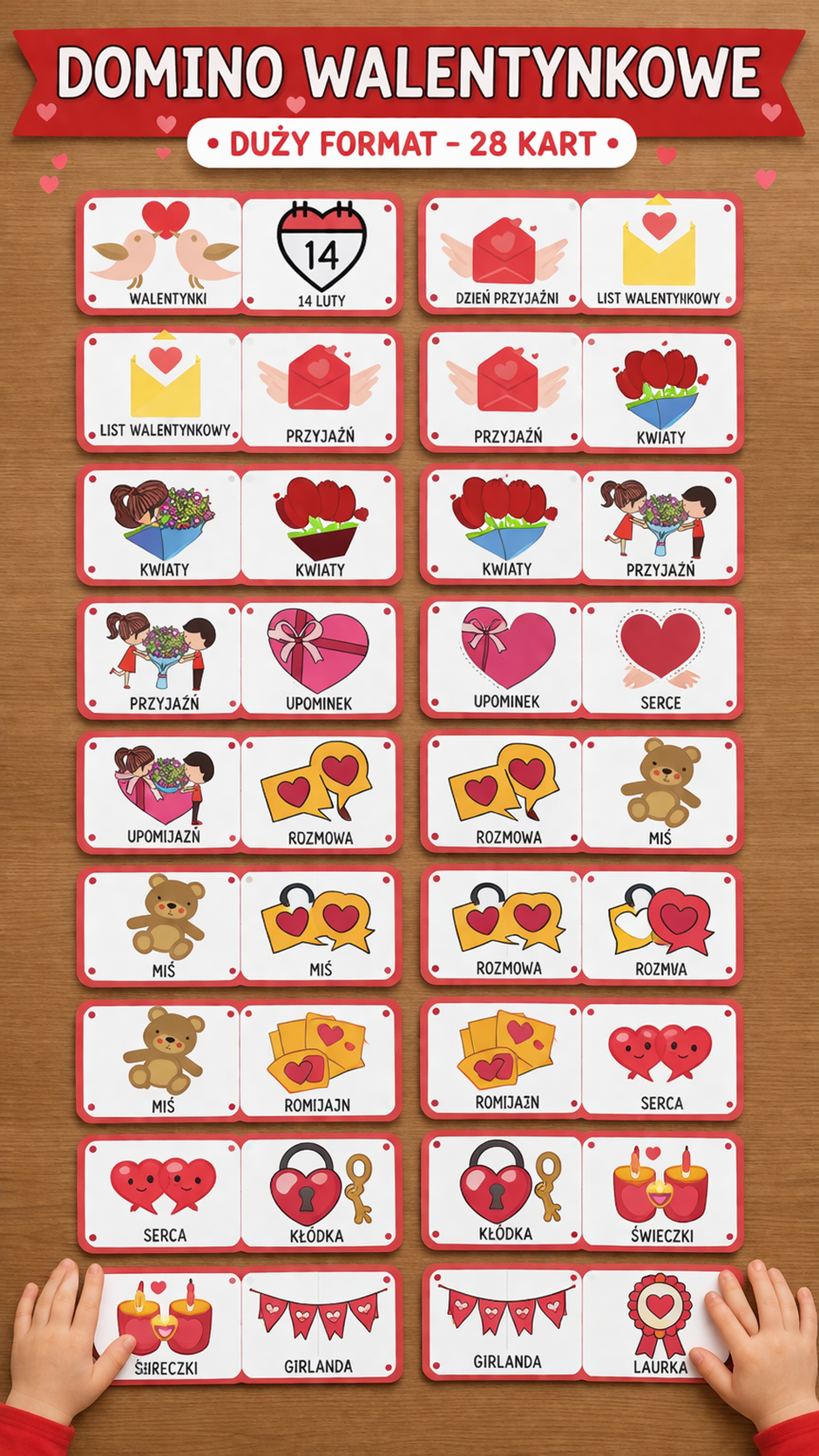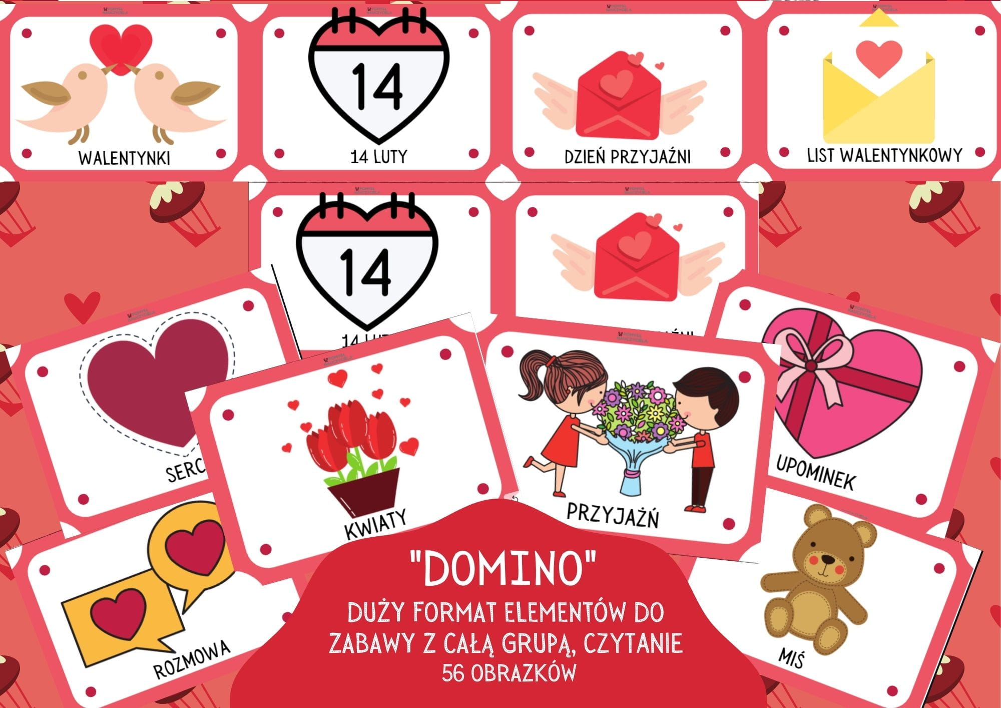 DOMINO WALENTYNKOWE DUŻY FORMAT DO ZABAWY Z CAŁĄ GRUPĄ, CZYTANIE WYRAZÓW