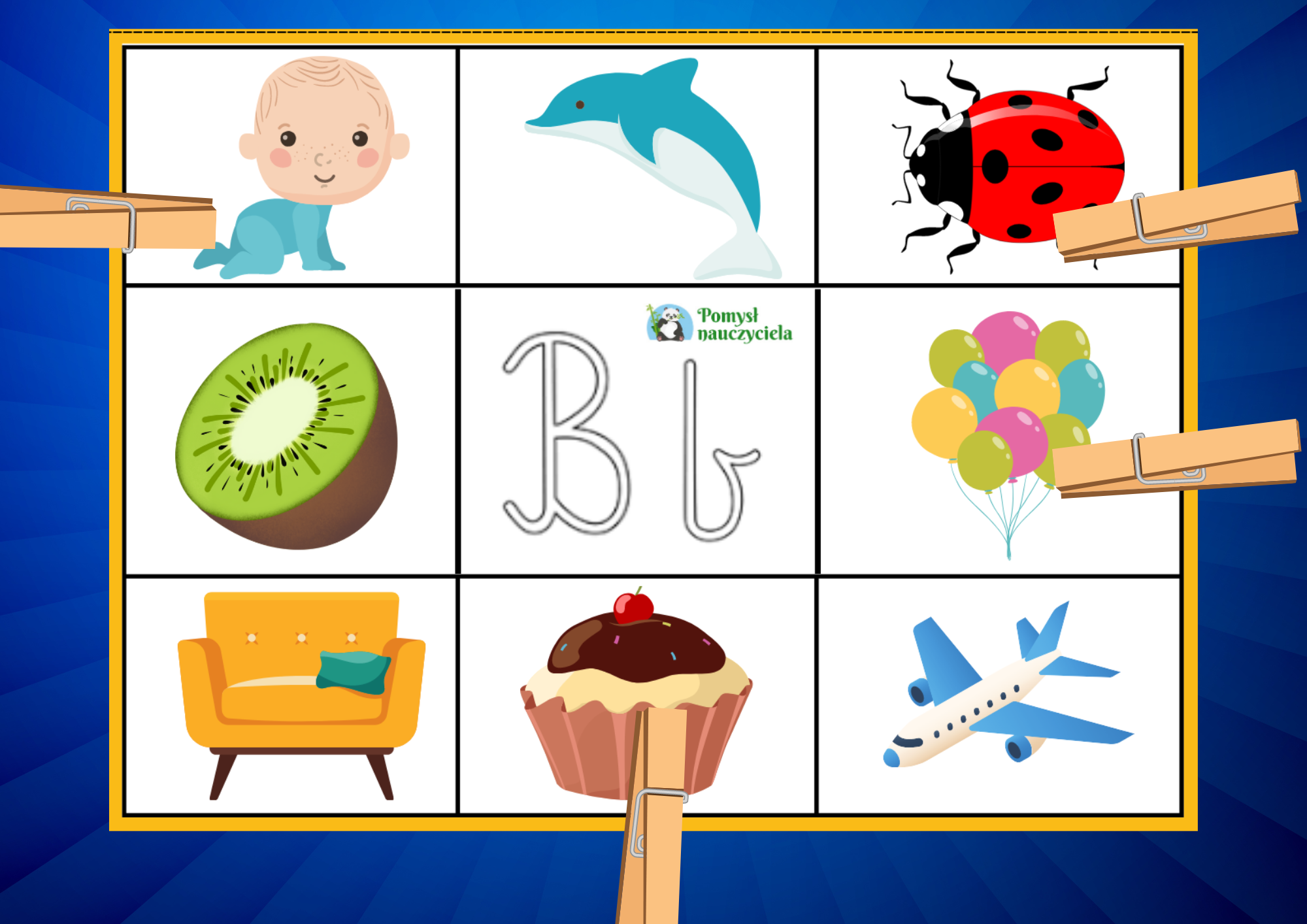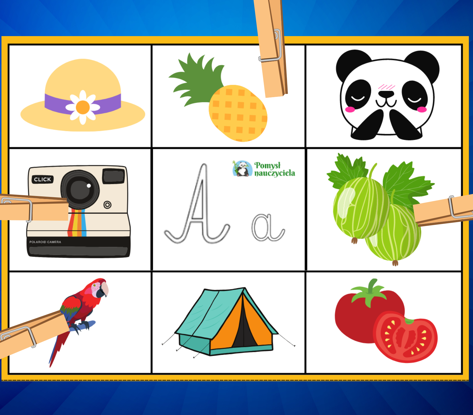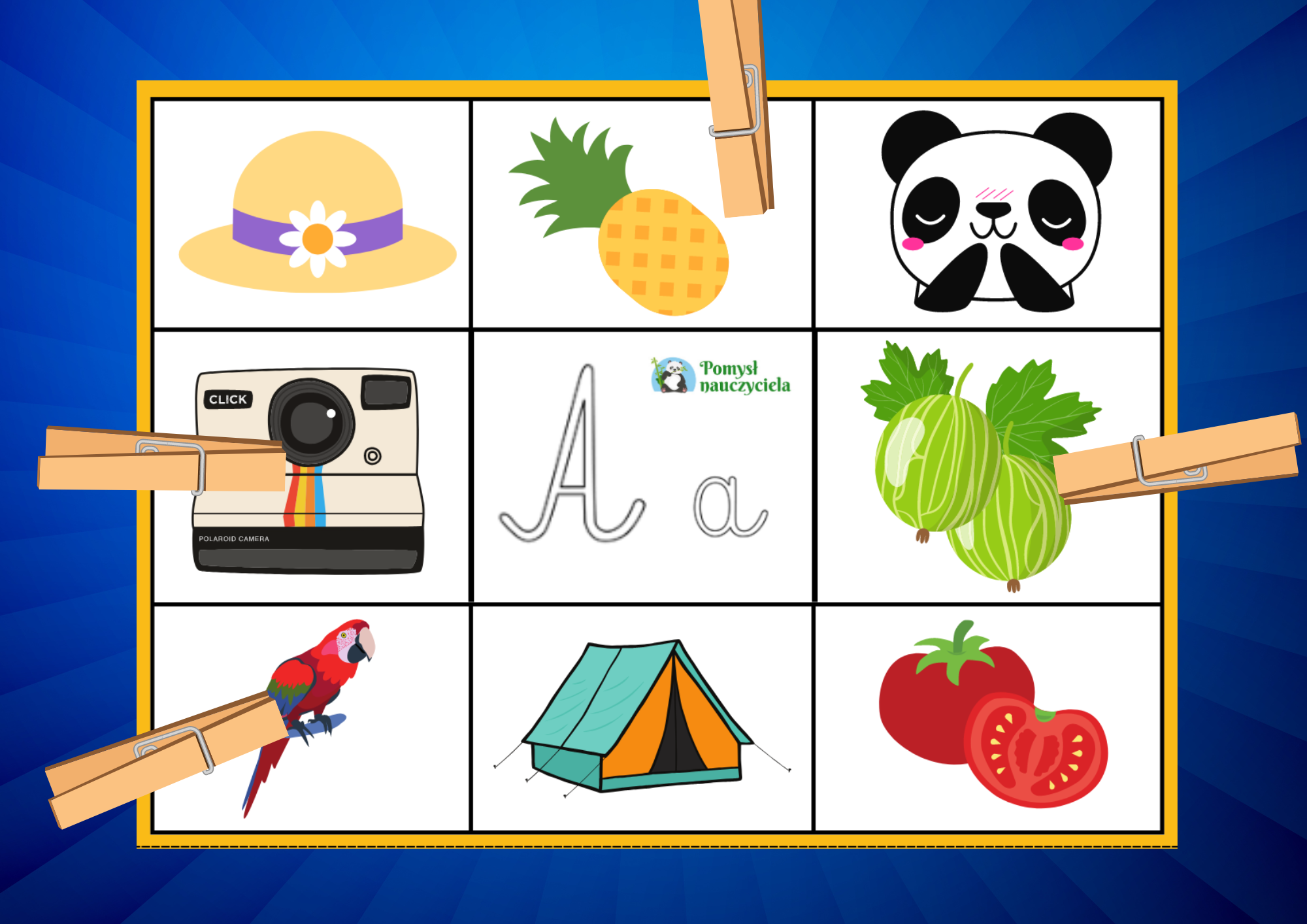 Karty klamerkowe to pomoc edukacyjna zawierająca plansze tematycznie związane z alfabetem. Zadanie polega na zaznaczeniu klamerką lub markerem suchościeralnym ilustracji rozpoczynających się na daną literę alfabetu.