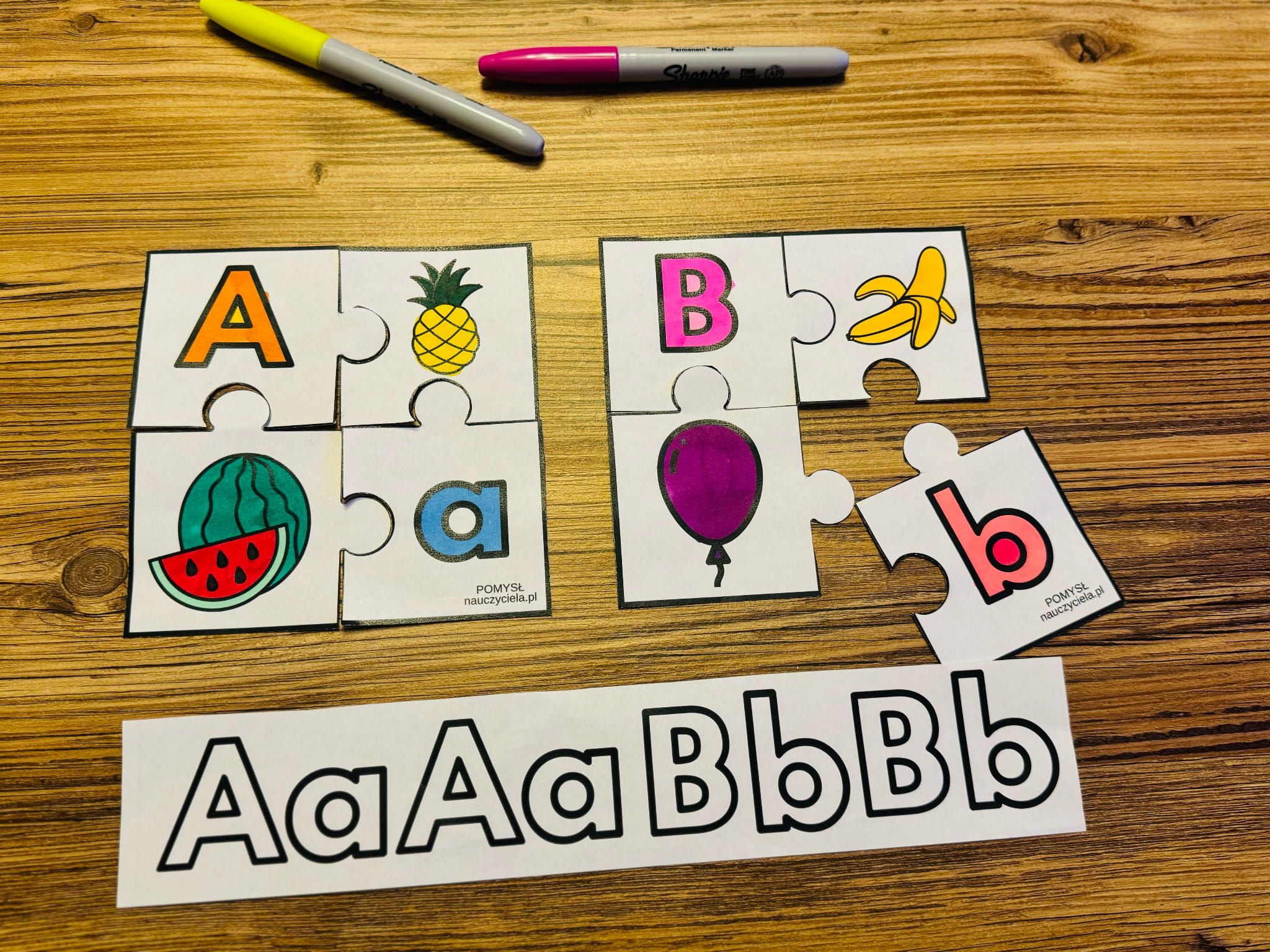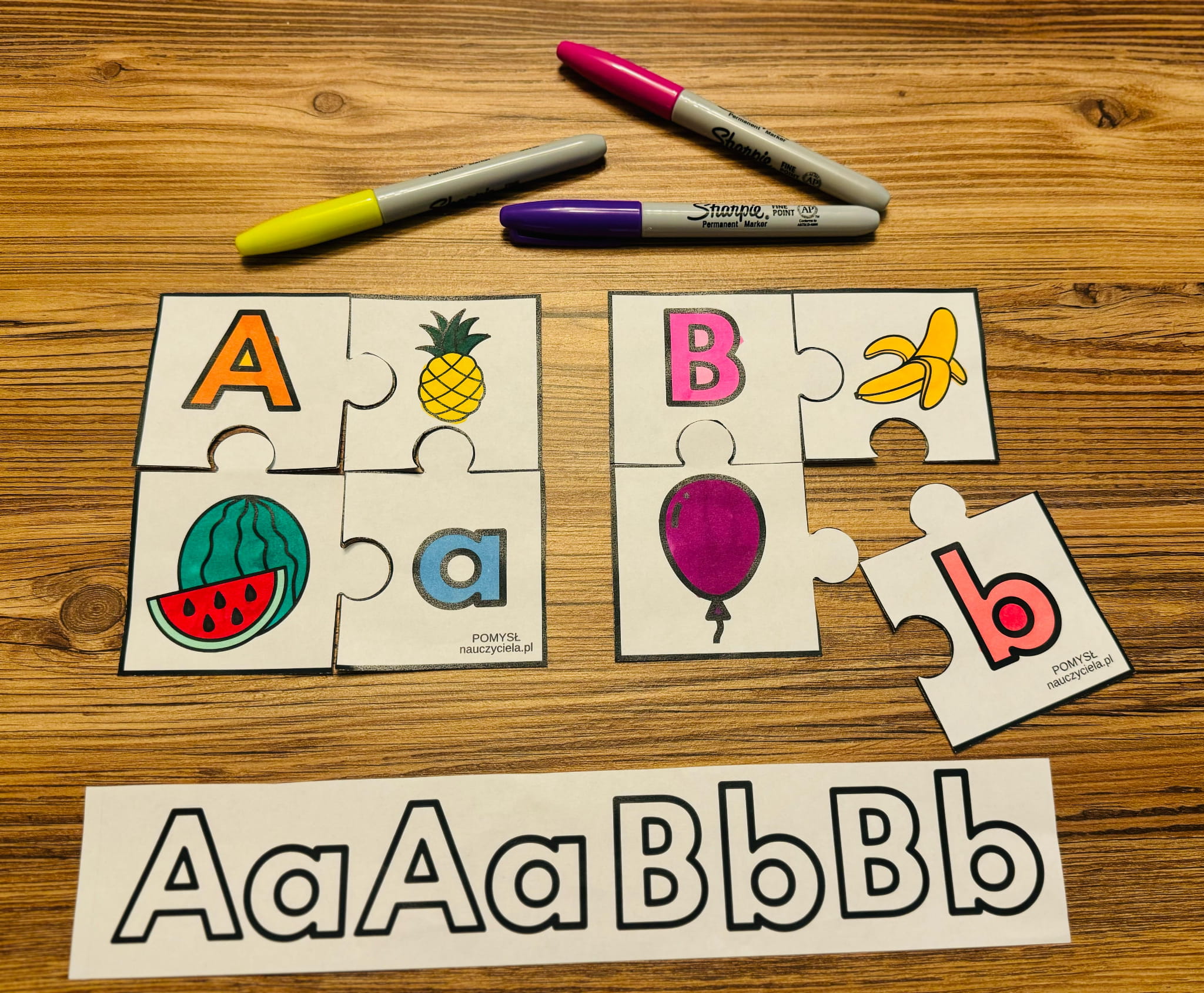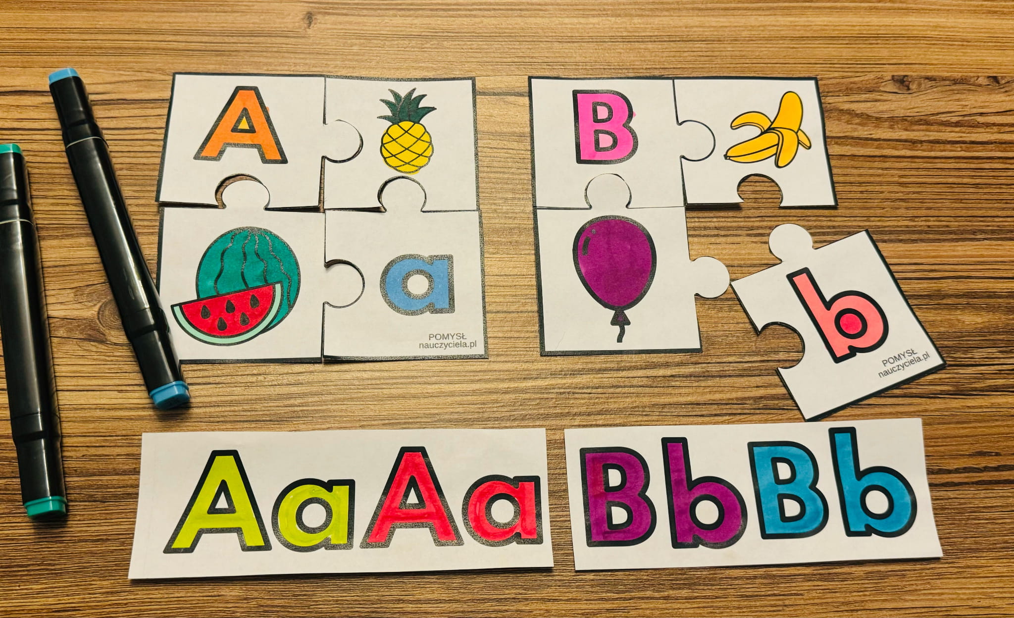 - Dzieci łączą puzzle, aby stworzyć pełny alfabet, układając litery w odpowiedniej kolejności.