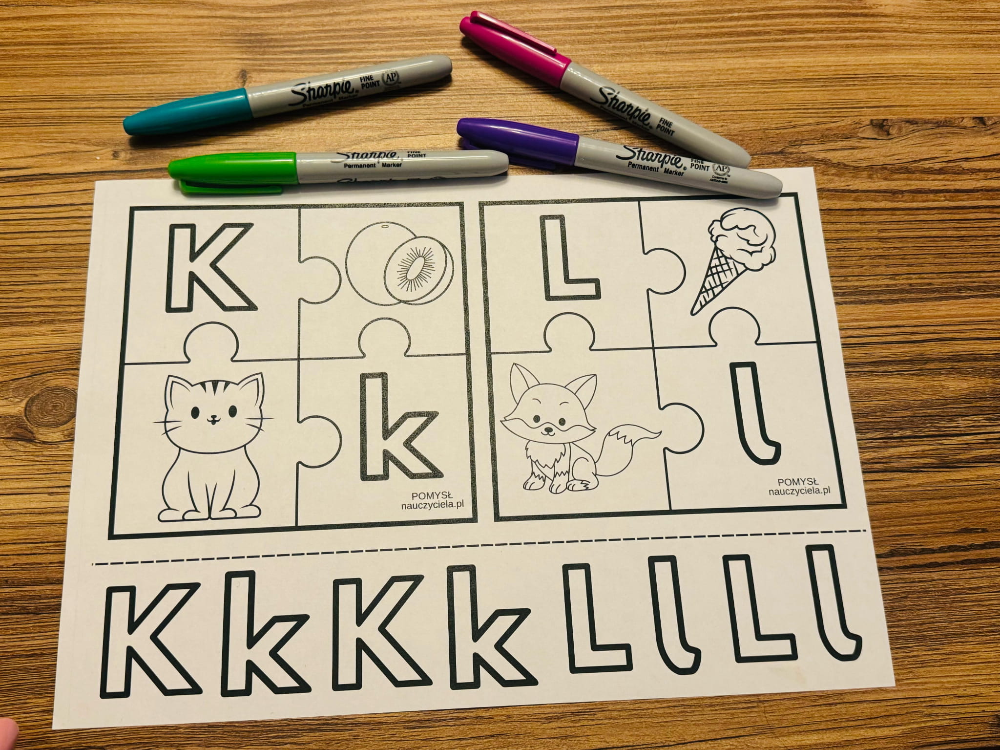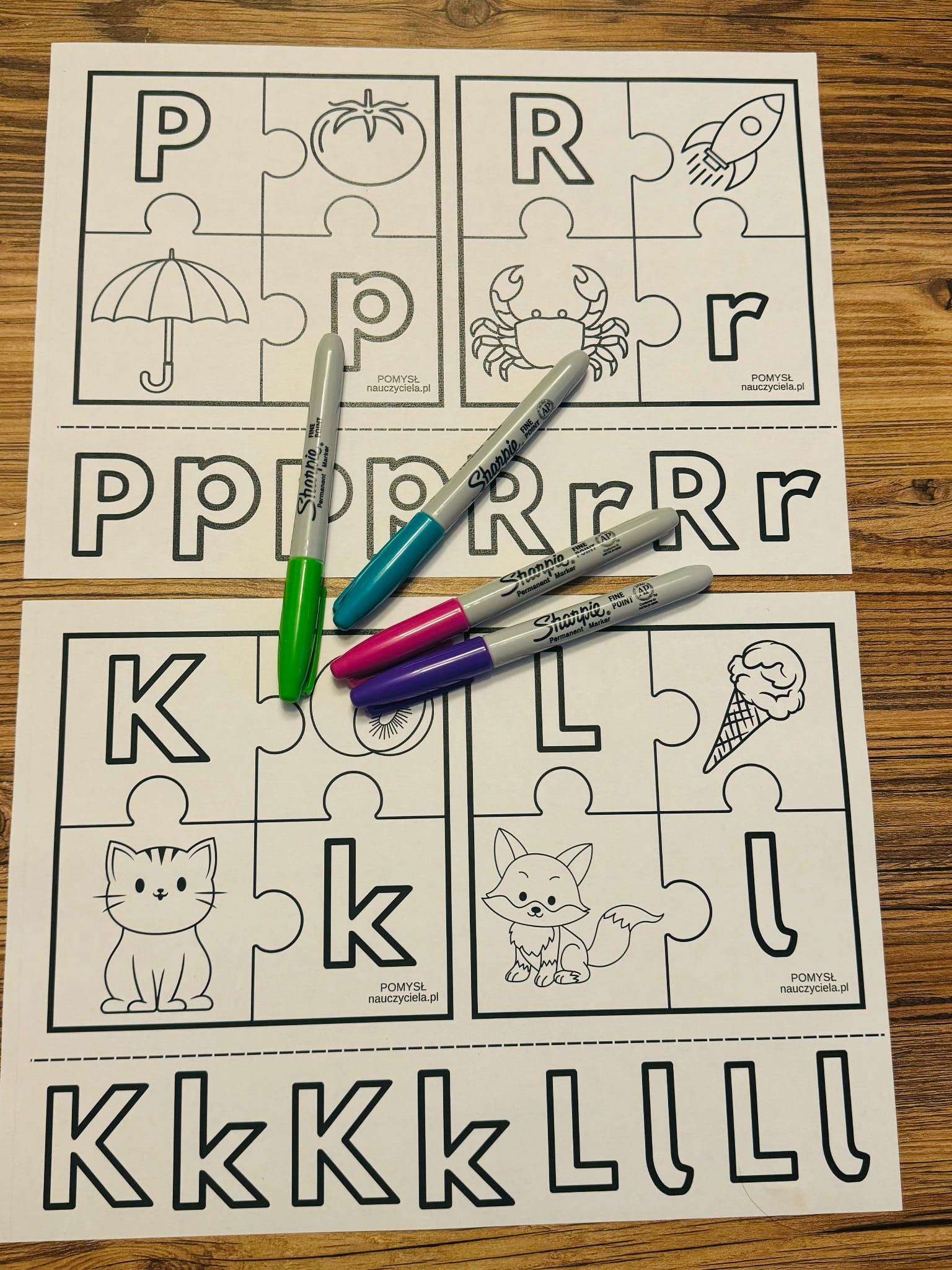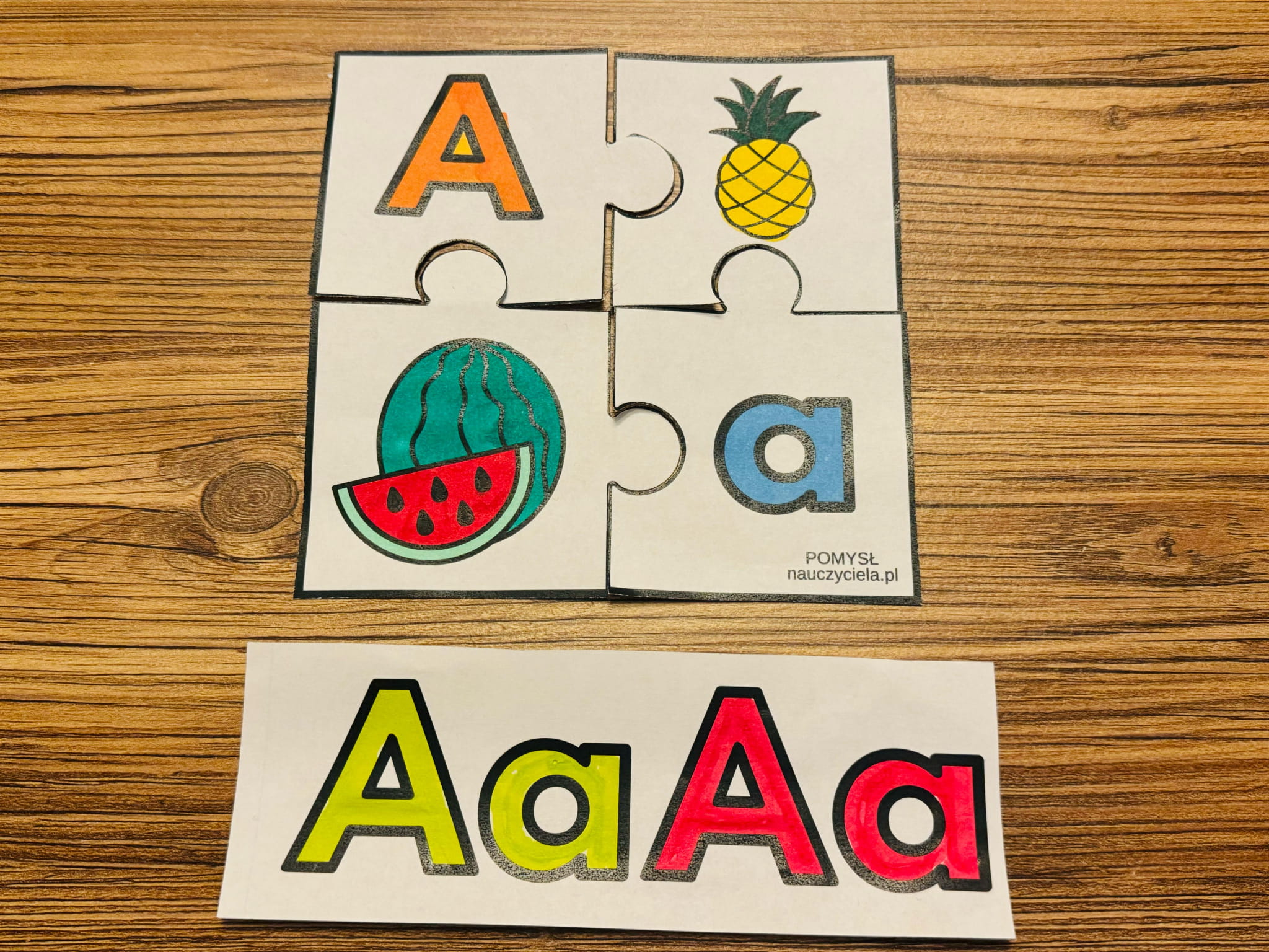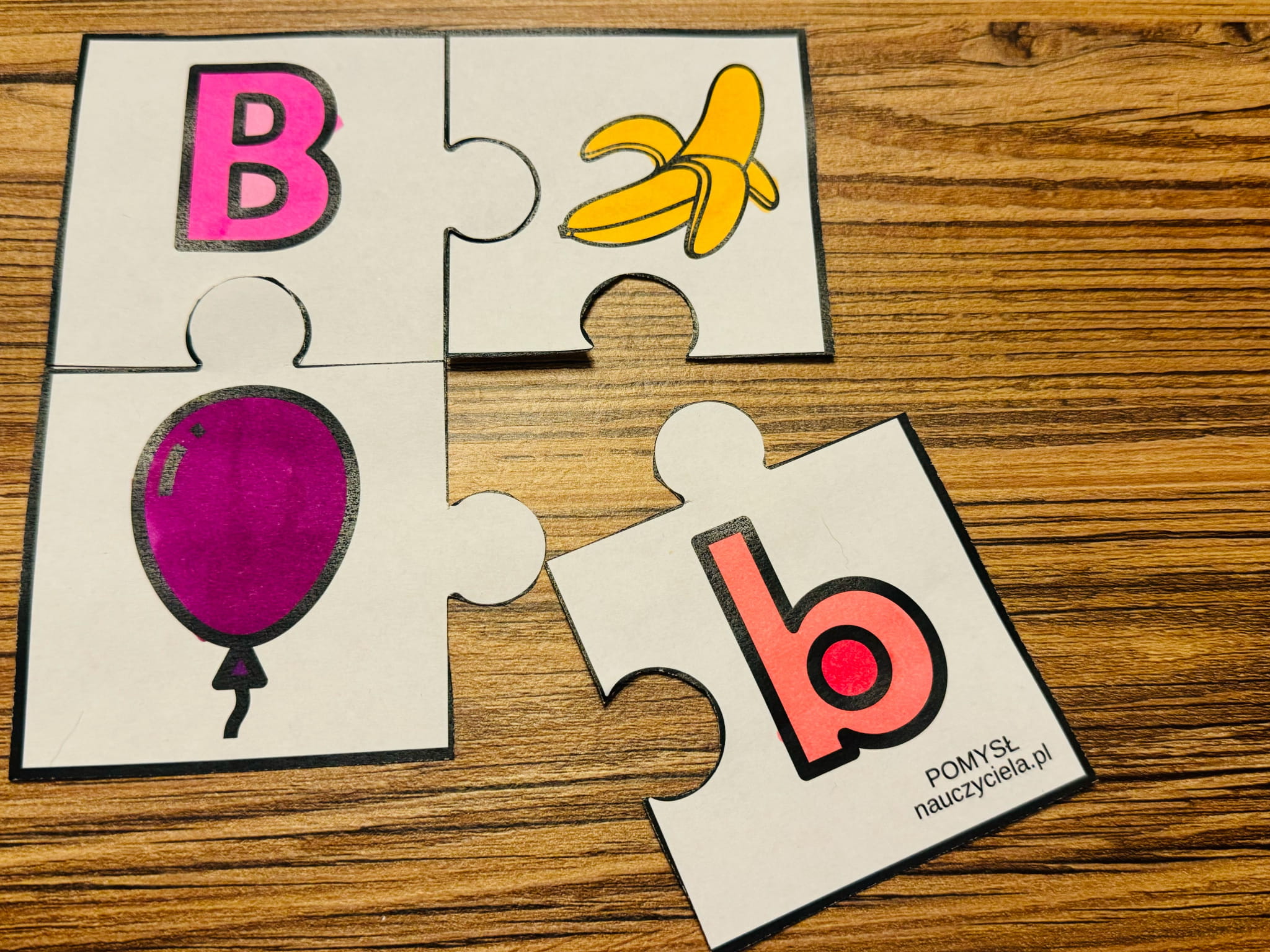- Dzieci łączą puzzle, aby stworzyć pełny alfabet, układając litery w odpowiedniej kolejności.