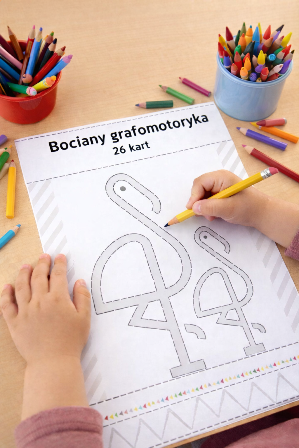 Dziecko pisze ołówkiem, kredką, flamastrem po śladzie BOCIANA oraz po innych wzorach.