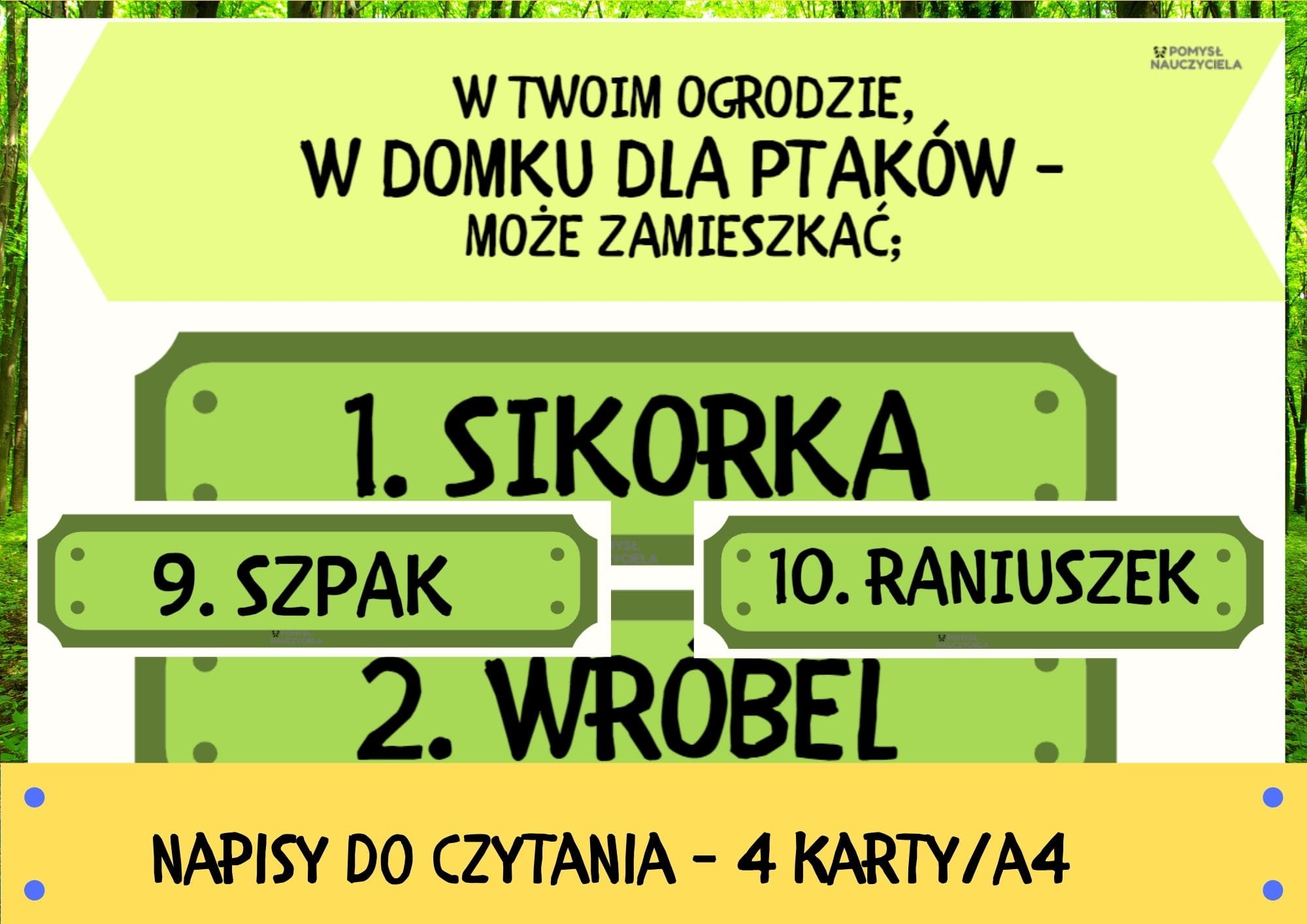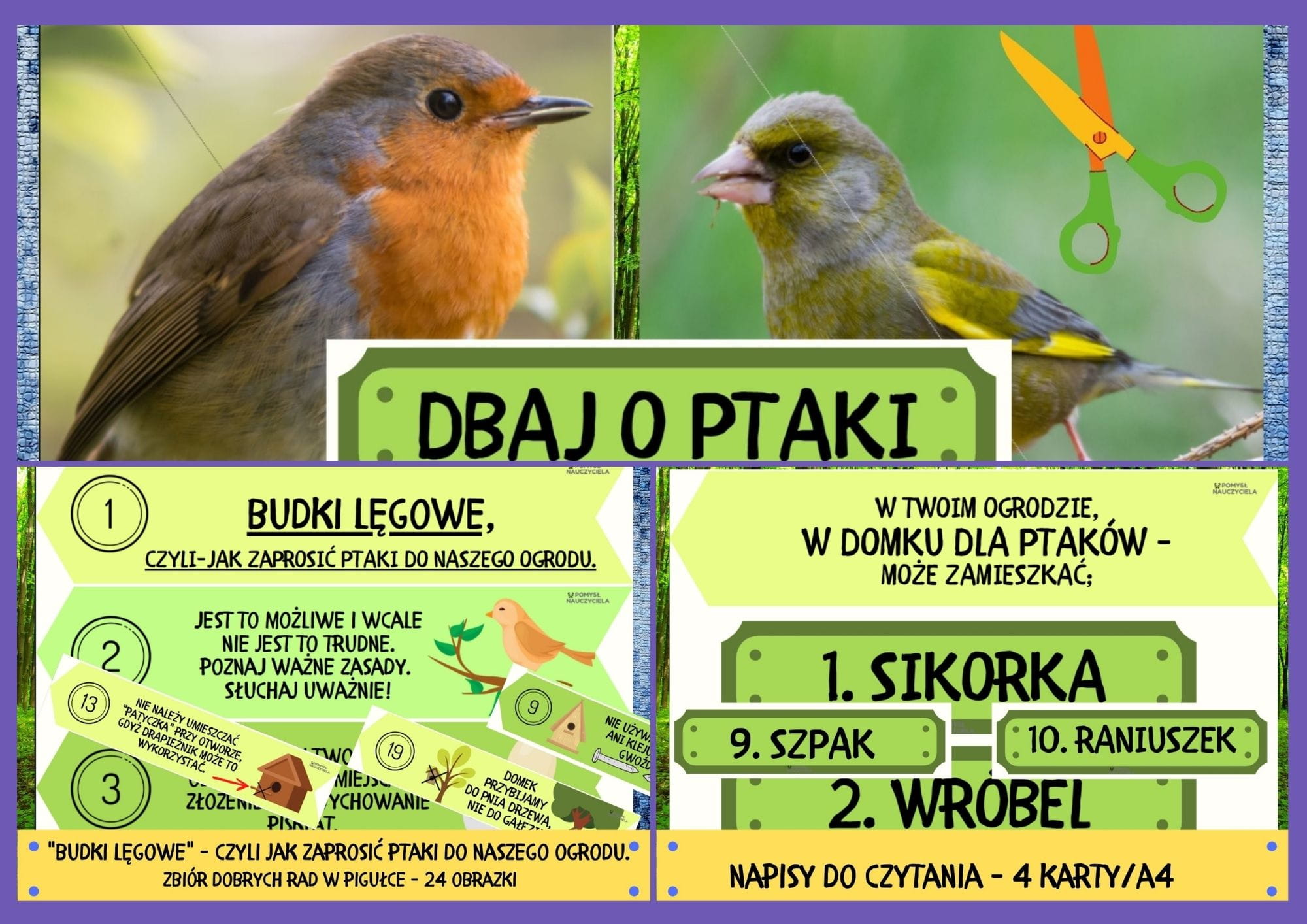 Pomoce zostały przygotowane w celu poszerzenia wiedzy dzieci na temat PTAKÓW WIOSNĄ. Pakiet pozwala na stworzenie plakatu edukacyjnego sprawdzającego wiedzę dzieci w tym zakresie. Zestaw posiada 24 ciekawostki w formie strzałek informacyjnych. Dzieci otrzymują dodatkowo obrazki ptaków, które mogą zamieszkać w naszym ogrodzie i ich zdjęcia w formie układanki.