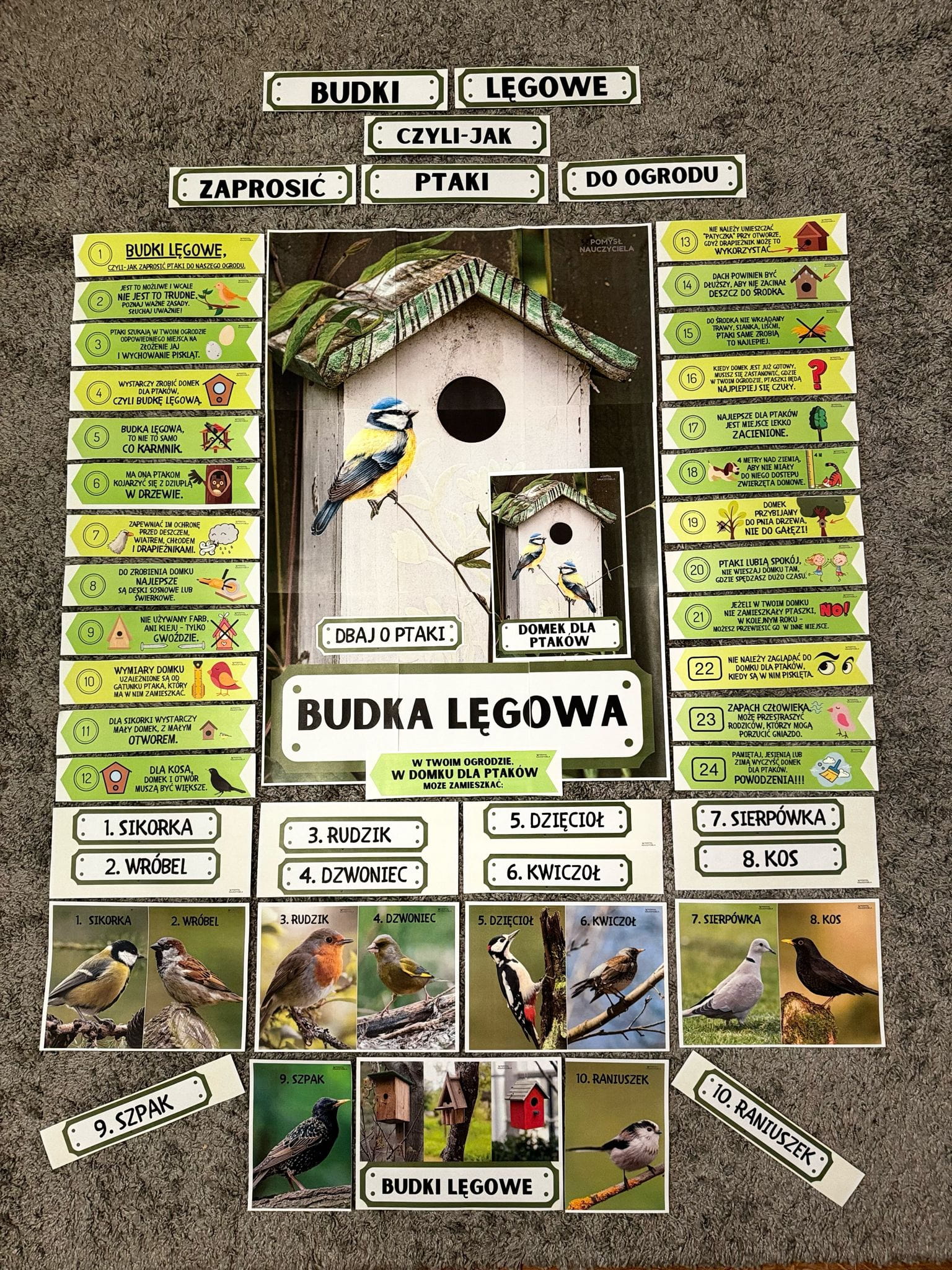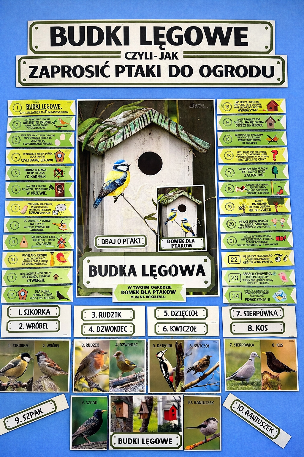 Zestaw zawiera spis dobrych rad w pigułce. Dzieci dowiedzą się co to jest budka lęgowa, czy ptaszki zamieszkają w każdym ogrodzie, dlaczego nie należy przybijać patyczka do budki lęgowej, czy ptaszki lubią słoneczne miejsce, czy zaciemnione..... i bardzo wiele innych cennych informacji.