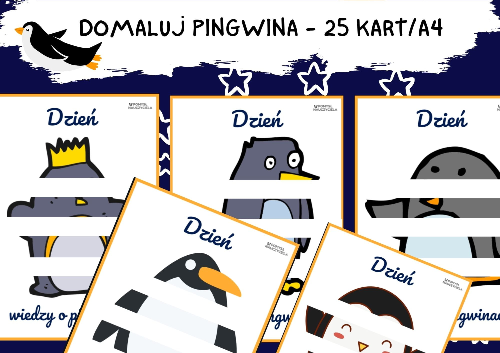 Zadaniem dziecka jest domalowanie brakujących elementów pingwina. W zestawie znajduje się 25 różnych pingwinów. Pomoc ta ułatwia pracę nauczycielowi bowiem karty po wydrukowaniu stanowią aktywność dla całej grupy. Po zakończeniu, obrazki można wyciąć, wykorzystać do prac plastycznych. Mogą one również stanowić dekorację kącika przyrodniczego lub kącika dla rodziców. Można stworzyć grupowa pracę przestrzenną, pt. "W krainie pingwinów."