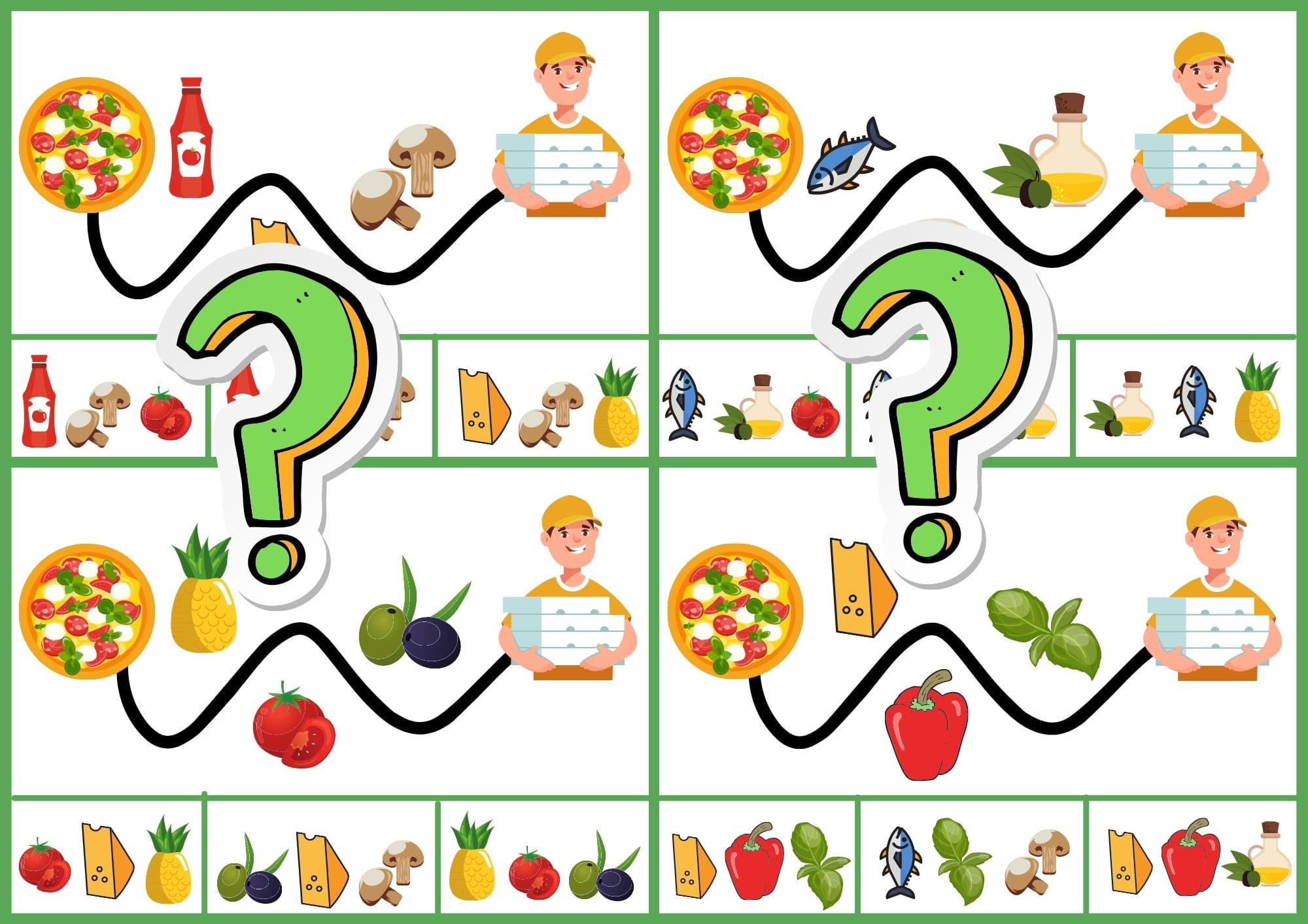 Zestaw Droga do pizzy powstał z myślą o rozwijaniu spostrzegawczości, logicznego myślenia oraz koncentracji uwagi. Polega na zapamiętaniu wszystkich elementów jakie musi minąć pizza, aby dotrzeć do opakowania. Ćwiczenie to polega głównie na zapamiętywaniu obrazków poprzez układanie ich zgodnie z kolejnością. Zadaniem dziecka jest odnalezienie odpowiedniej odpowiedzi oraz przyczepienie w jej miejscu np. klamerki, spinacza. Pomoc droga do pizzy może zostać także wykorzystana jako zakończenie Dnia Pizzy oraz utrwalenie zdobytych w tym dniu informacji.