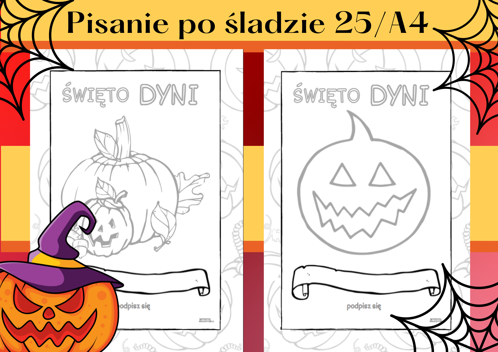 Dziecko pisze ołówkiem, kredką, flamastrem po śladzie DYNIĘ. W zestawie znajduje się 25 różnych DYNIOWYCH OBRAZKÓW. Pomoc ta ułatwia pracę nauczycielowi, bowiem karty po wydrukowaniu stanowią aktywność dla całej grupy. Po zakończeniu pisania po śladzie, obrazki można pokolorować kredkami, pastelami, pomalować farbami, stworzyć wyklejankę, wydzierankę. Gotowe prace mogą stanowić ozdobę i dekorację sali, lub można wyeksponować je jako prace plastyczne w kąciku dla rodziców.