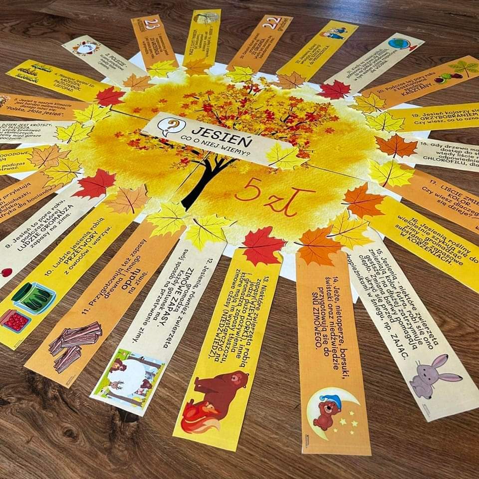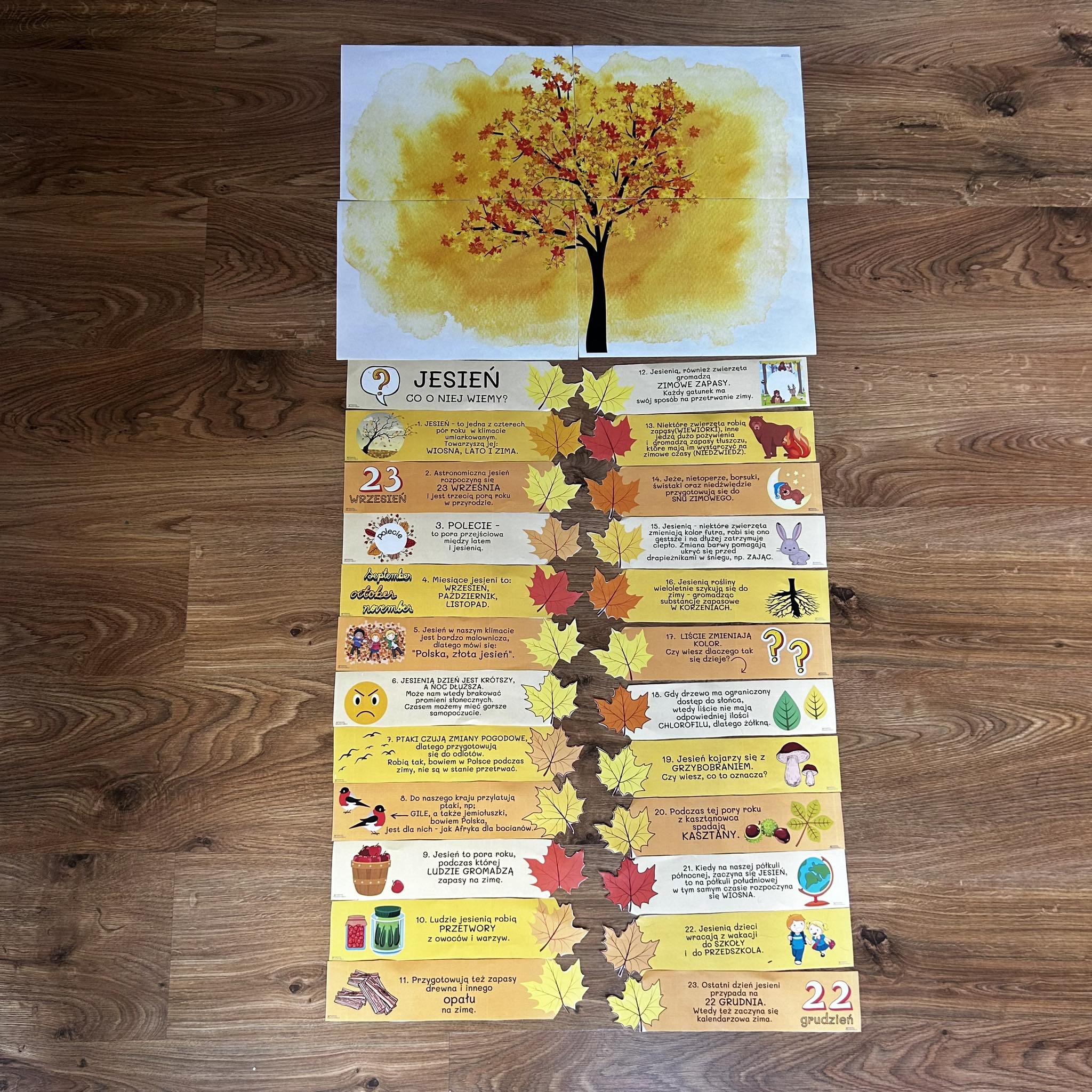 Pomoce zostały przygotowane w celu poszerzenia wiedzy dzieci na temat JESIENI. Zestaw zawiera 23 ciekawostki na temat JESIENI w formie pasków informacyjnych. Na każdym pasku znajduje się jesienny liść oraz dodatkowo duże drzewo 4/a4. Po ułożeniu wszystkich informacji powstanie jesienne drzewo otoczone paskami informacyjnymi. Materiały można również zalaminować, aby dłużej się nimi cieszyć. Zestaw wspomaga rozwój mowy i słownictwa dziecka oraz inne funkcje poznawcze. Pakiet pozwala na stworzenie jesiennego plakatu edukacyjnego lub gazetki edukacyjnej.
