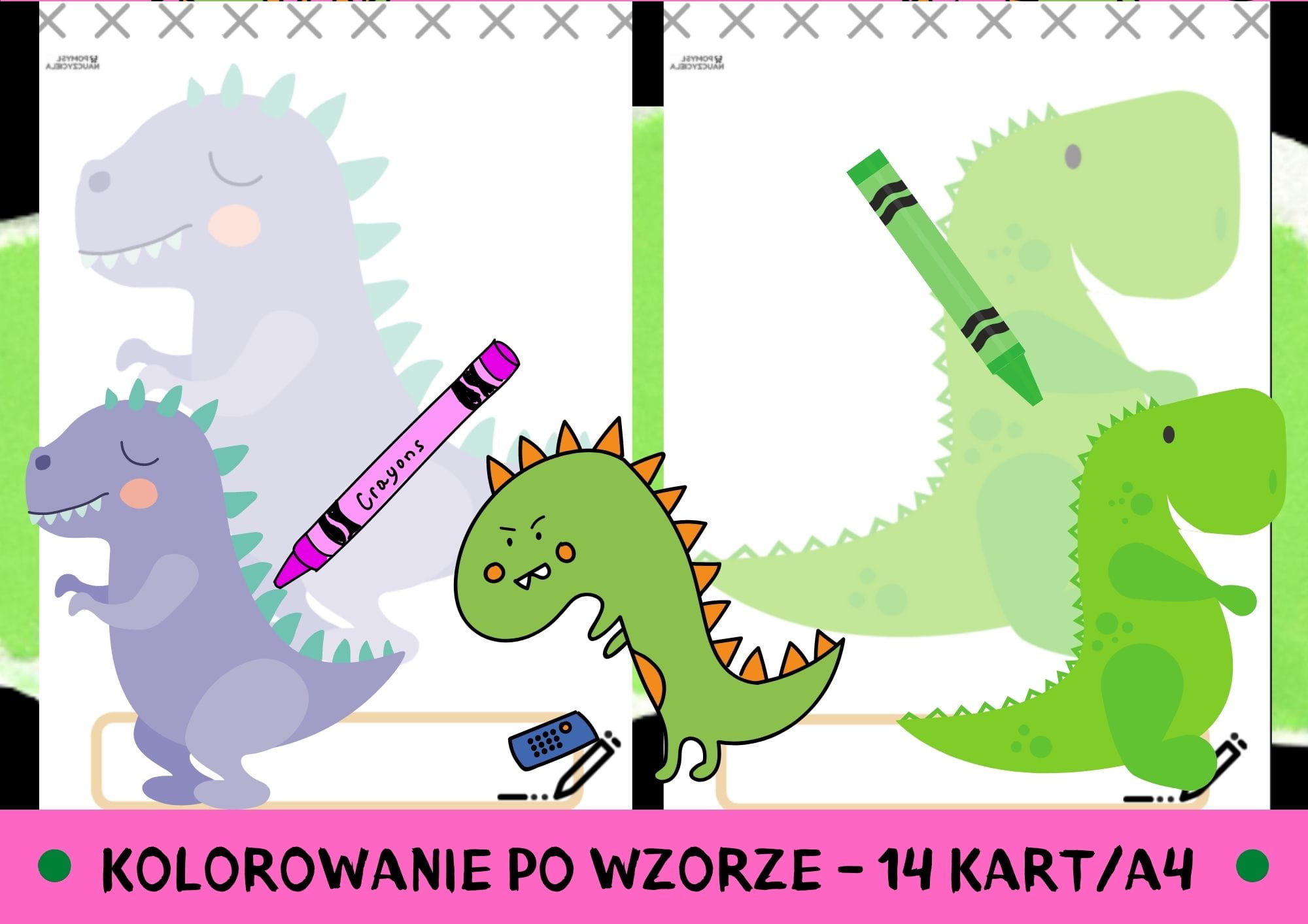 Dziecko koloruje kredką, flamastrem po cieniach dinozaurów. W zestawie znajduje się 14 różnych dinozaurów. Pomoc ta ułatwia pracę nauczycielowi, bowiem karty po wydrukowaniu stanowią aktywność dla całej grupy. Obrazki można pokolorować kredkami, pastelami, pomalować farbami, stworzyć wyklejankę, wydzierankę. Gotowe prace mogą stanowić ozdobę i dekorację sali, lub można wyeksponować je jako prace plastyczne w kąciku dla rodziców. Dodatkowo w ramce dziecko może samodzielnie wpisać swoje imię, podpisać pracę.