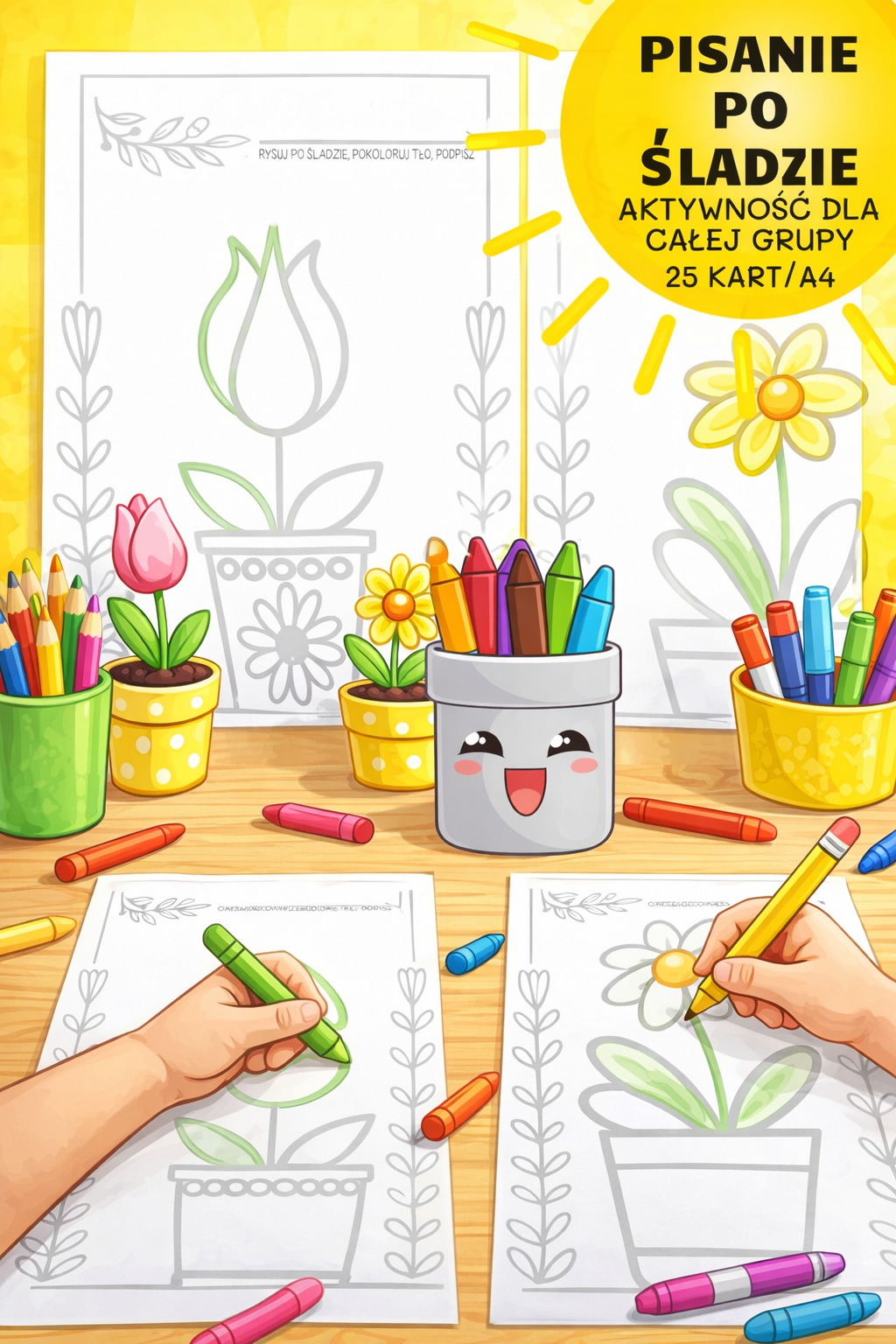 Dzieci rysując wiosenne kwiaty po śladzie ołówkiem, flamastrem lub kredką ćwiczą motorykę małą, koordynację wzrokowo-ruchową, sprawność manualną, a przy tym doskonale się bawią. Do pracy z tymi pomocami, oprócz ołówka można wykorzystać: kredki, pastele, farby plakatowe, akwarele, papier kolorowy, gazety, itp. Celem zajęć grafomotorycznych jest doskonalenie sprawności manualnych małych dzieci, rozwijanie motoryki małej i koordynacji wzrokowo-ruchowej, doskonalenie orientacji przestrzennej, usprawnianie umiejętności prawidłowego posługiwania się przyborami piszącymi. Pisanie po śladzie ma duże znaczenie w przyszłej nauce czytania.
