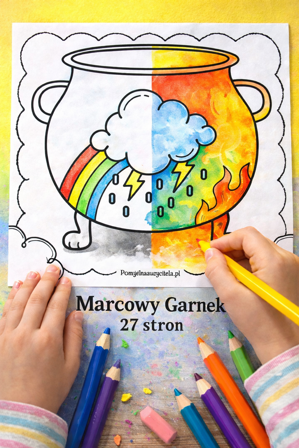 Na każdej kartce znajduje się inne zjawisko atmosferyczne i miejsce, aby dzieci domalowały różne elementy pogody według własnego pomysłu.