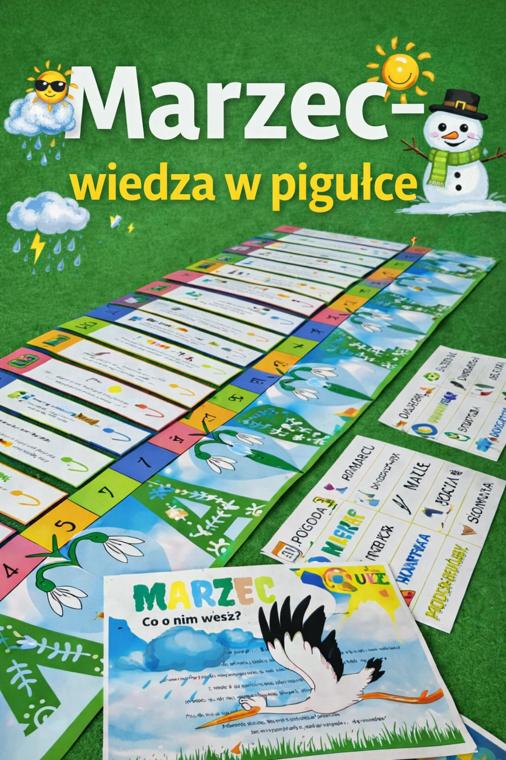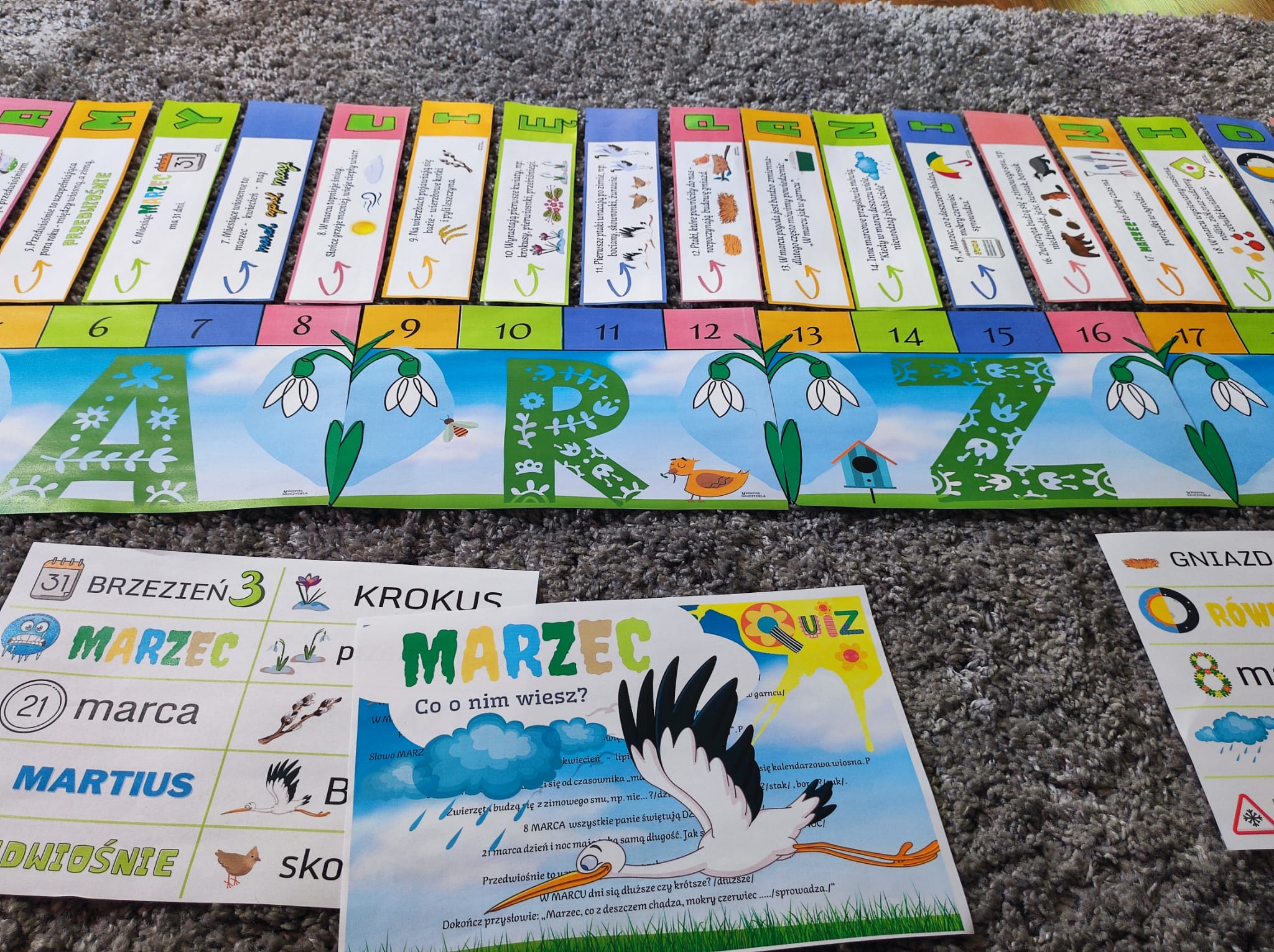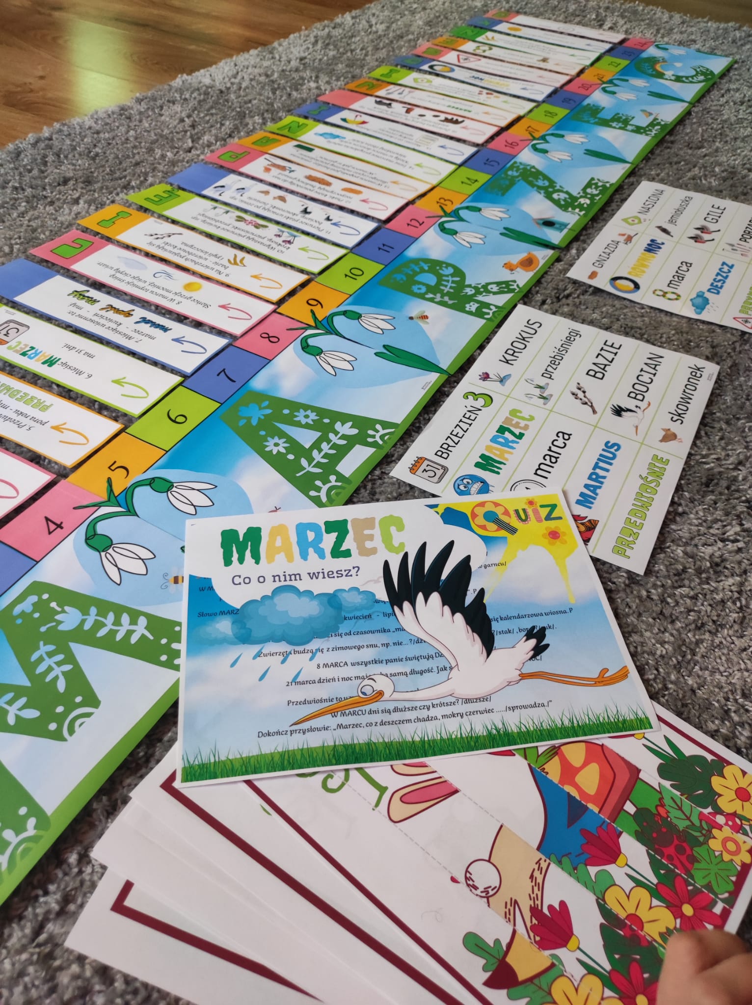 W zestawie znajdują się również karty obrazkowo-wyrazowe kontrolujące wiedzę dzieci z tego tematu oraz QUIZ. Ponadto projekt posiada wiosenne obrazki, które można wyciąć i wykorzystać do zrobienia puzzli, lub dopasowania do każdego obrazka właściwego elementu.