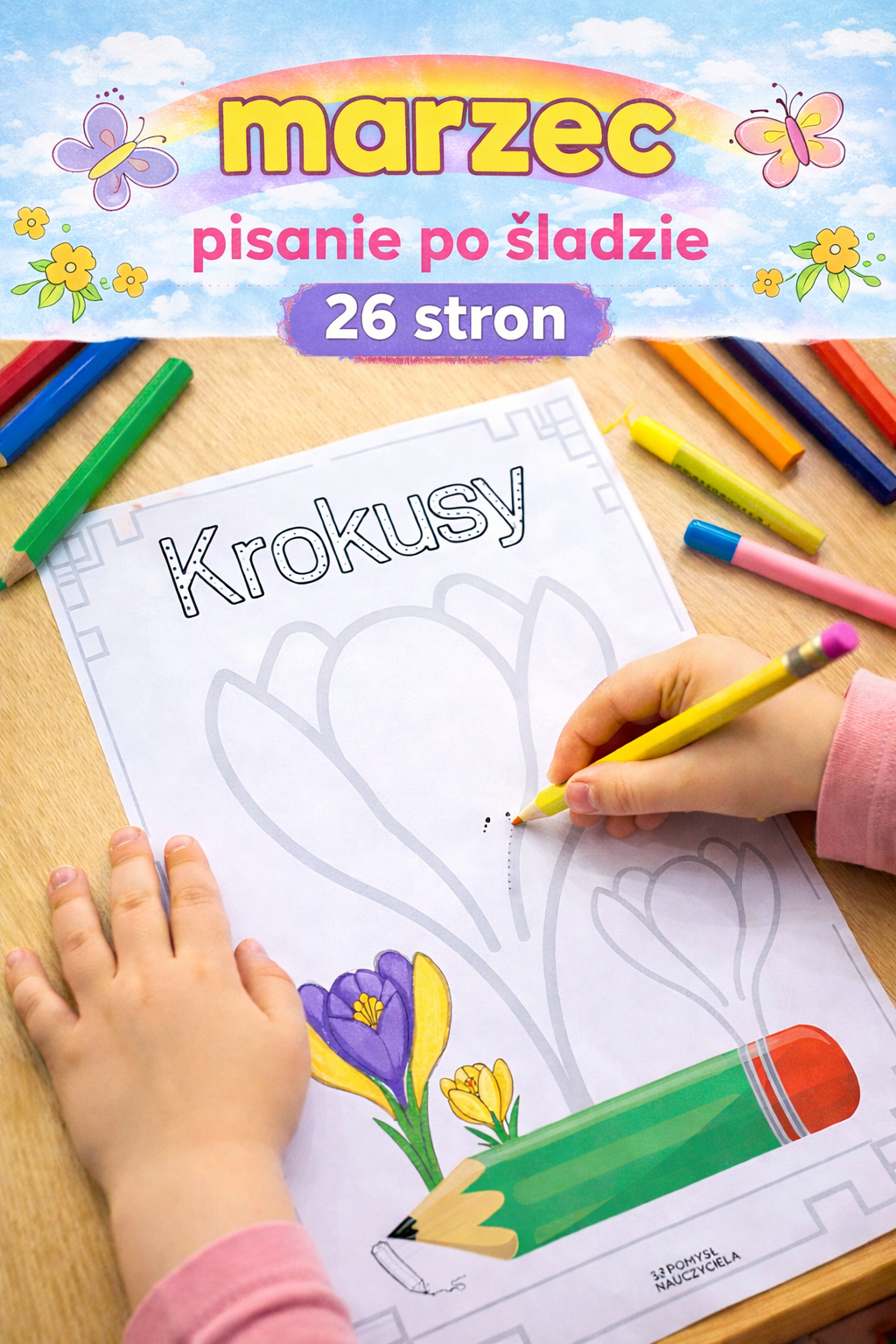 Dzieci rysując po śladzie ołówkiem, flamastrem lub kredką ćwiczą motorykę małą, koordynację wzrokowo-ruchową, sprawność manualną, a przy tym doskonale się bawią. Karty posiadają dodatkowo 26 napisów do czytania i kolorowania. Karty zostały tak zaprojektowane, aby zawierały ilustracje związane z wiosną. 26 różnych kart grafomotorycznych daje możliwość pracy dla całej grupy.