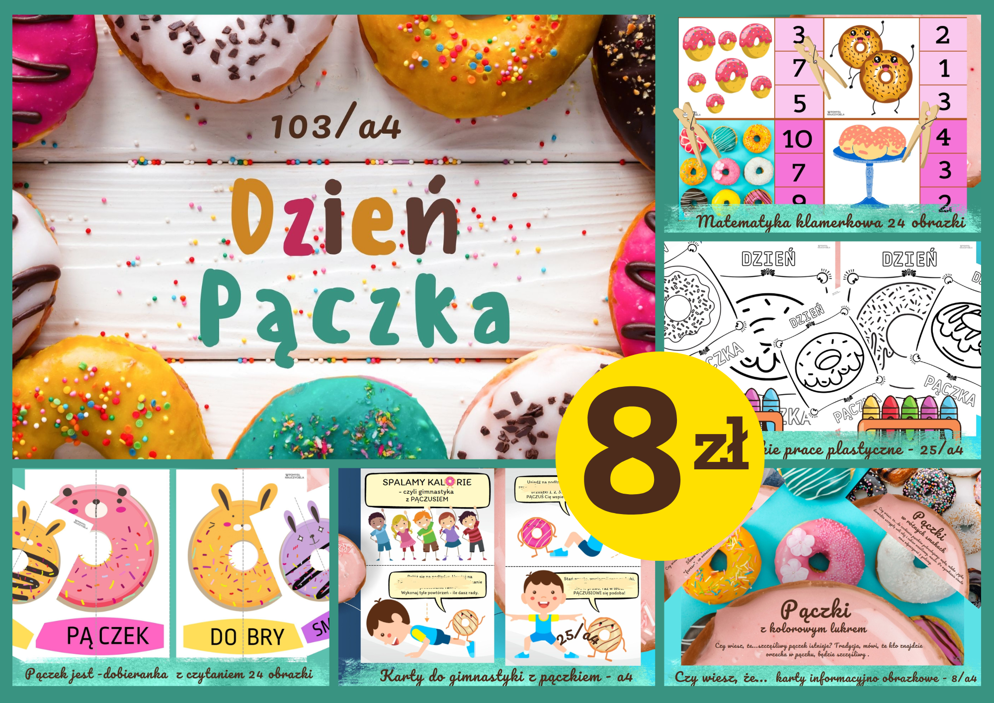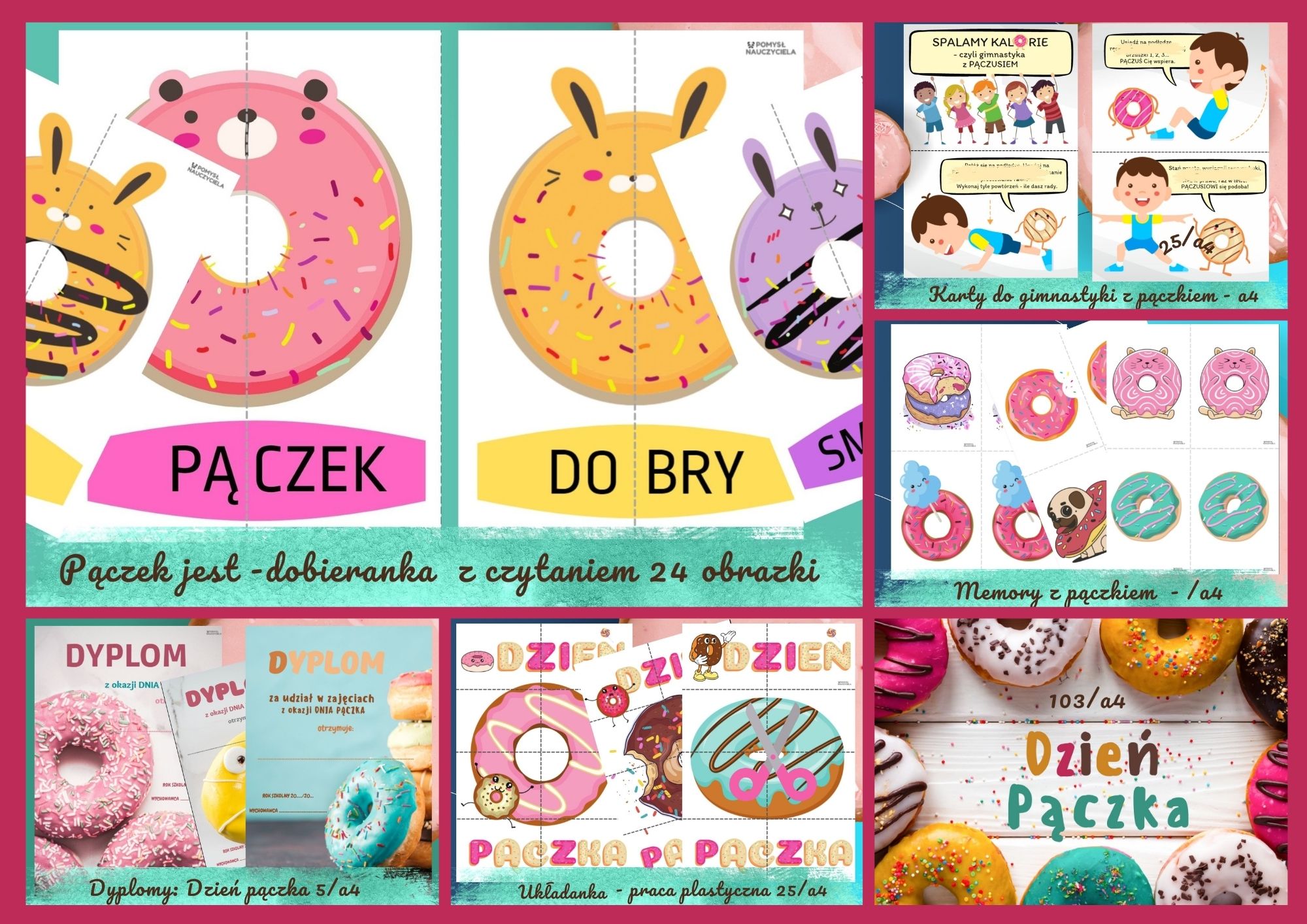 Pakiet DZIEŃ PĄCZKA ma celu wspieranie nauczycieli i rodziców w procesie edukowania dzieci w wieku przedszkolnym i wczesnoszkolnym. Dla prawidłowego rozwoju dziecka niezbędne jest dostarczanie mu odpowiedniej ilości bodźców, dlatego należy łączyć zabawę z nauką. Treści zawarte w projekcie rozwijają funkcje odpowiedzialne za powodzenie w przyszłej nauce czytania i pisania. Inspirują dzieci do twórczych, kreatywnych aktywności w oparciu o wybrany krąg tematyczny.