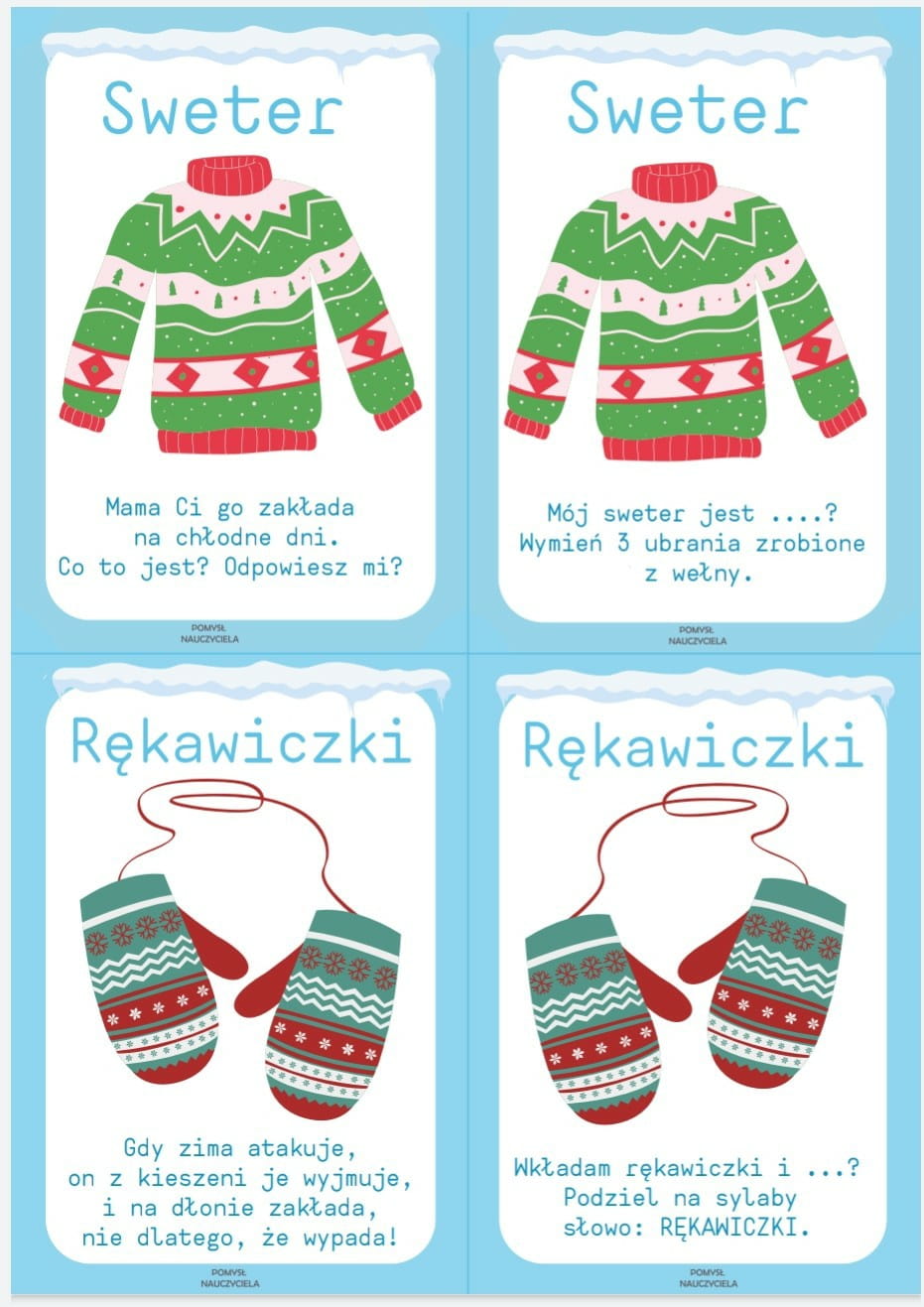 Karty są wielozadaniowe, bowiem można z dziećmi wykorzystać je wielokrotnie, na różne sposoby i przy wielu działaniach edukacyjnych w okresie zimowym, np. szukanie takich samych sylwet, rozwiązywanie zimowych zagadek, zabawa: "dokończ zdanie", wykonywanie poleceń zawartych w kartach, taniec w parach tych samych obrazków, odmalowywanie lub odwzorowywanie obrazków podczas prac plastycznych, zbiory, przeliczanie, segregowanie, do ćwiczeń językowych: Mój sweterek jest...?, Moje rękawiczki są...? do gry w memory.