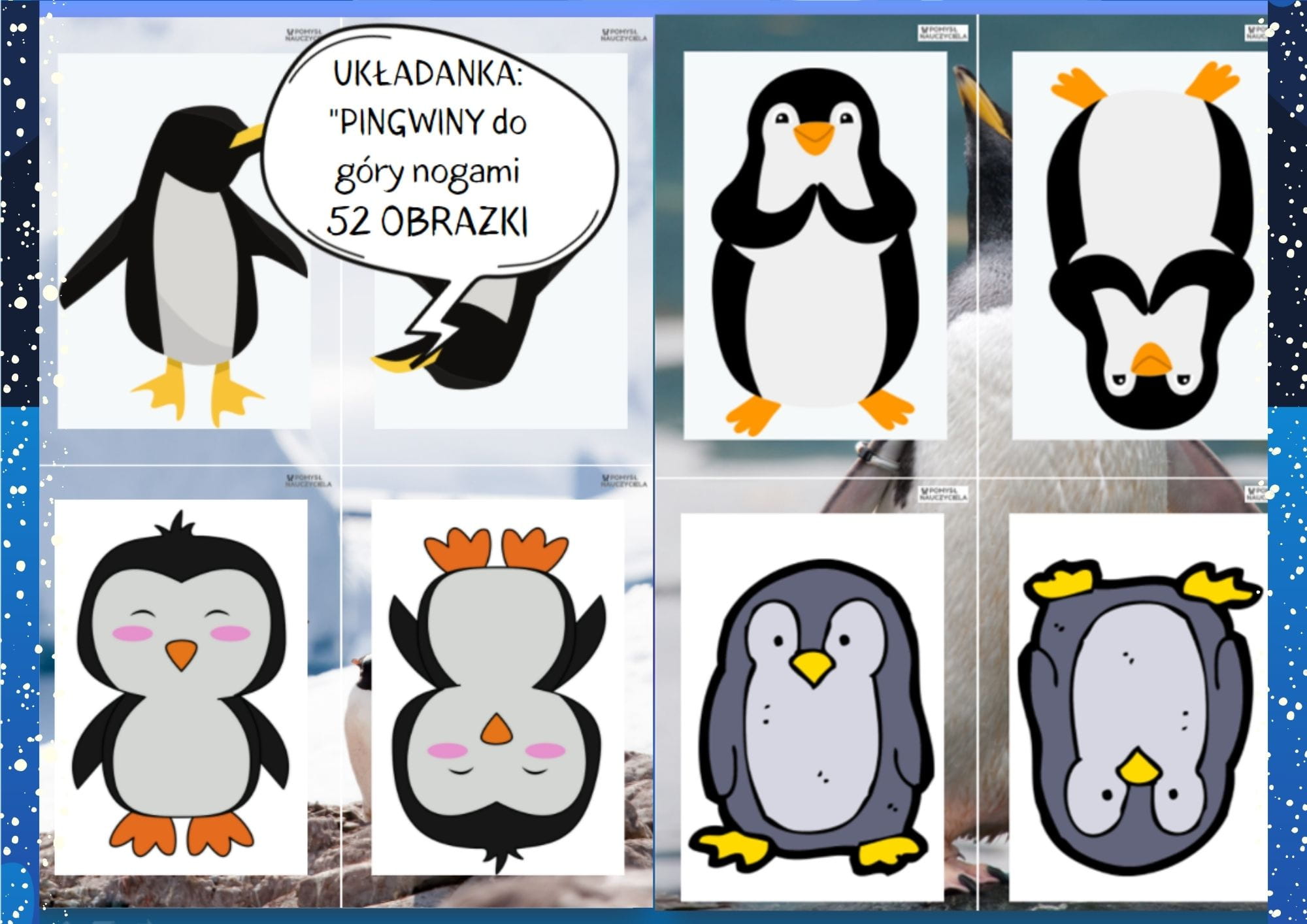 Karty należy wydrukować i zalaminować, aby dłużej mogły służyć do zabawy dzieciom. Zadaniem dziecka jest dobranie w pary pasujących obrazków: pingwin + pingwin do góry nogami. Celem zajęć jest stymulowanie rozwoju percepcji wzrokowej, zapewnienie dziecku możliwości nabywania umiejętności, których rozwój warunkuje w przyszłości prawidłową naukę czytania, pisania, a także liczenia. Dobieranka to znakomity trening pamięci, który uczy logicznego myślenia i rozpoznawania kształtów. Gdy dziecko dopasowuje właściwy element do części obrazka, ćwiczy chwytność palców oraz precyzję ruchów. Zabawę można wykorzystać podczas zajęć z grupą, w małym zespole, w czasie zajęć indywidualnych, korekcyjno-kompensacyjnych. Karty z pingwinami można użyć do gry memory, przeliczania, segregowania, odwzorowywania.