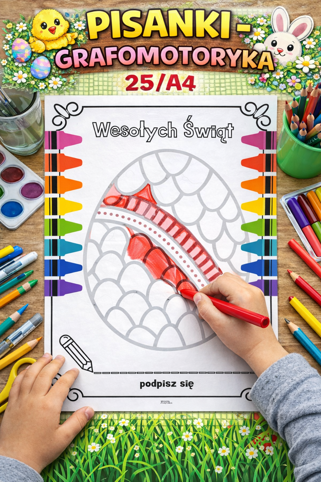 Dziecko pisze ołówkiem, kredką, flamastrem po śladzie PISANIKI. W zestawie znajduje się 25 różnych sylwet pisanek. Po zakończeniu pisania po śladzie, obrazki można pokolorować kredkami, pastelami, pomalować farbami, stworzyć wyklejankę, wydzierankę. Gotowe prace mogą stanowić ozdobę i dekorację sali, lub można wyeksponować je jako prace plastyczne w kąciku dla rodziców.