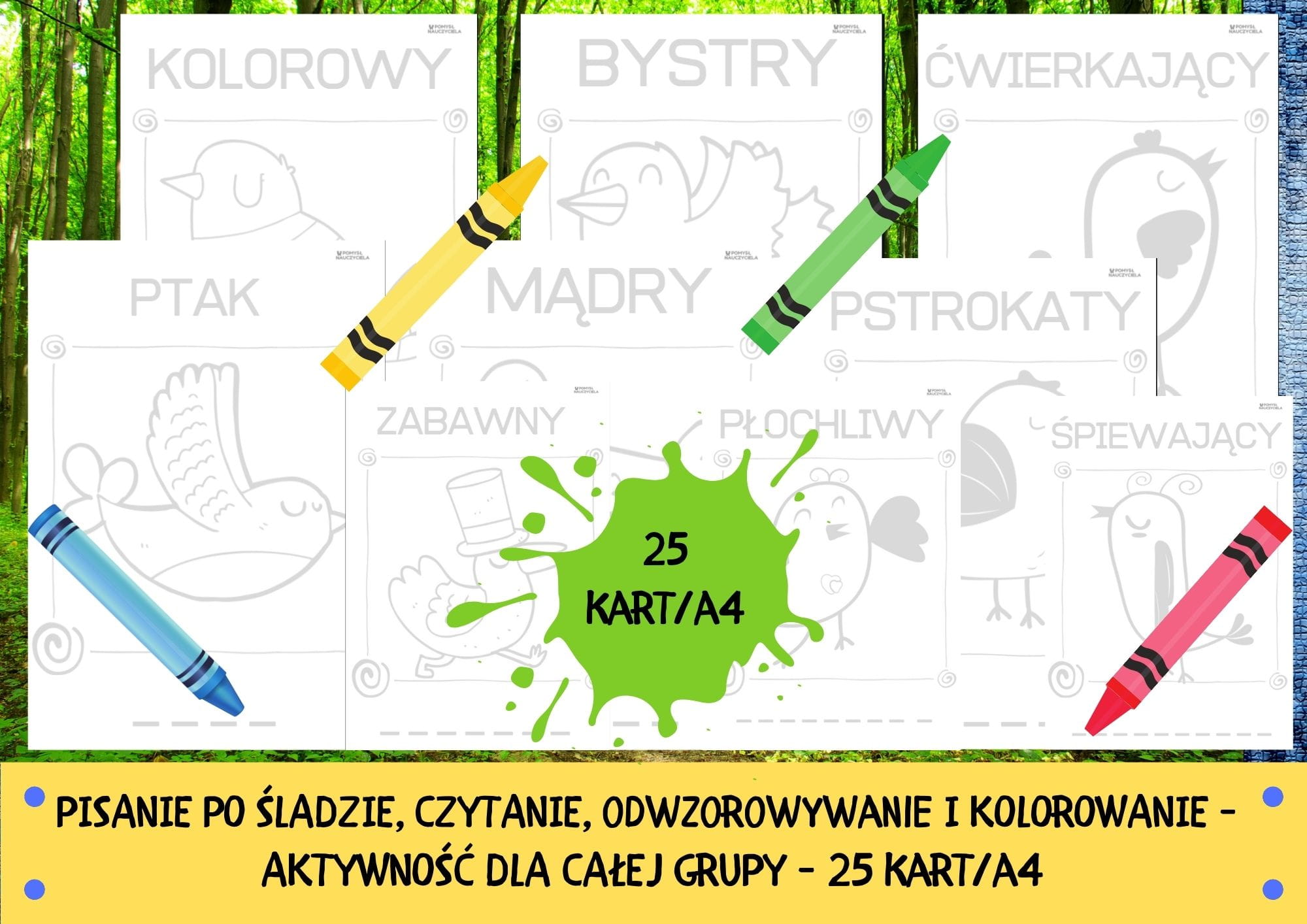 Dziecko pisze ołówkiem, kredką, flamastrem po śladzie PTASZKA. W zestawie znajduje się 25 różnych PTAKÓW. Dodatkowo każdy obrazek ma inne określenie ptaszka do czytania, odwzorowania, pisania, kolorowania. Pomoc ta ułatwia pracę nauczycielowi, bowiem karty po wydrukowaniu stanowią aktywność dla całej grupy. Po zakończeniu pisania po śladzie, obrazki można pokolorować kredkami, pastelami, pomalować farbami, stworzyć wyklejankę, wydzierankę.