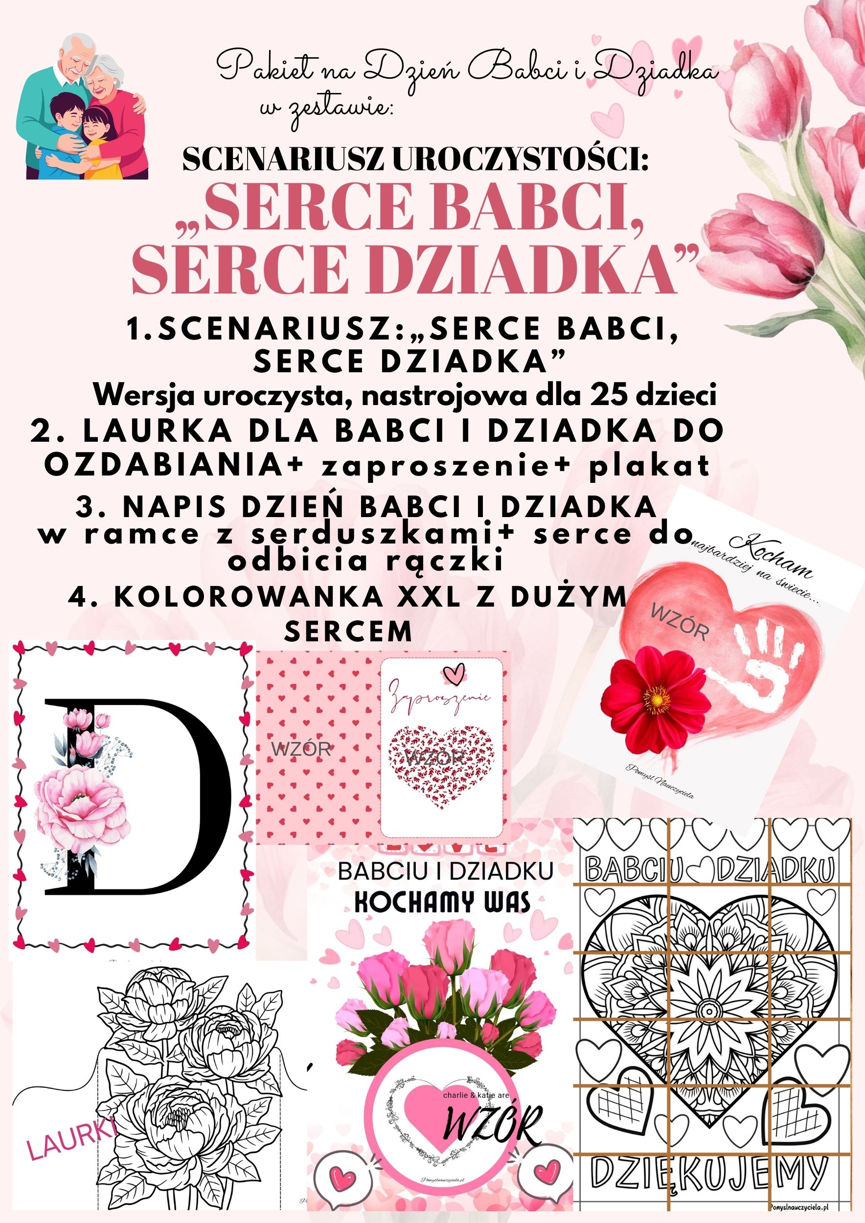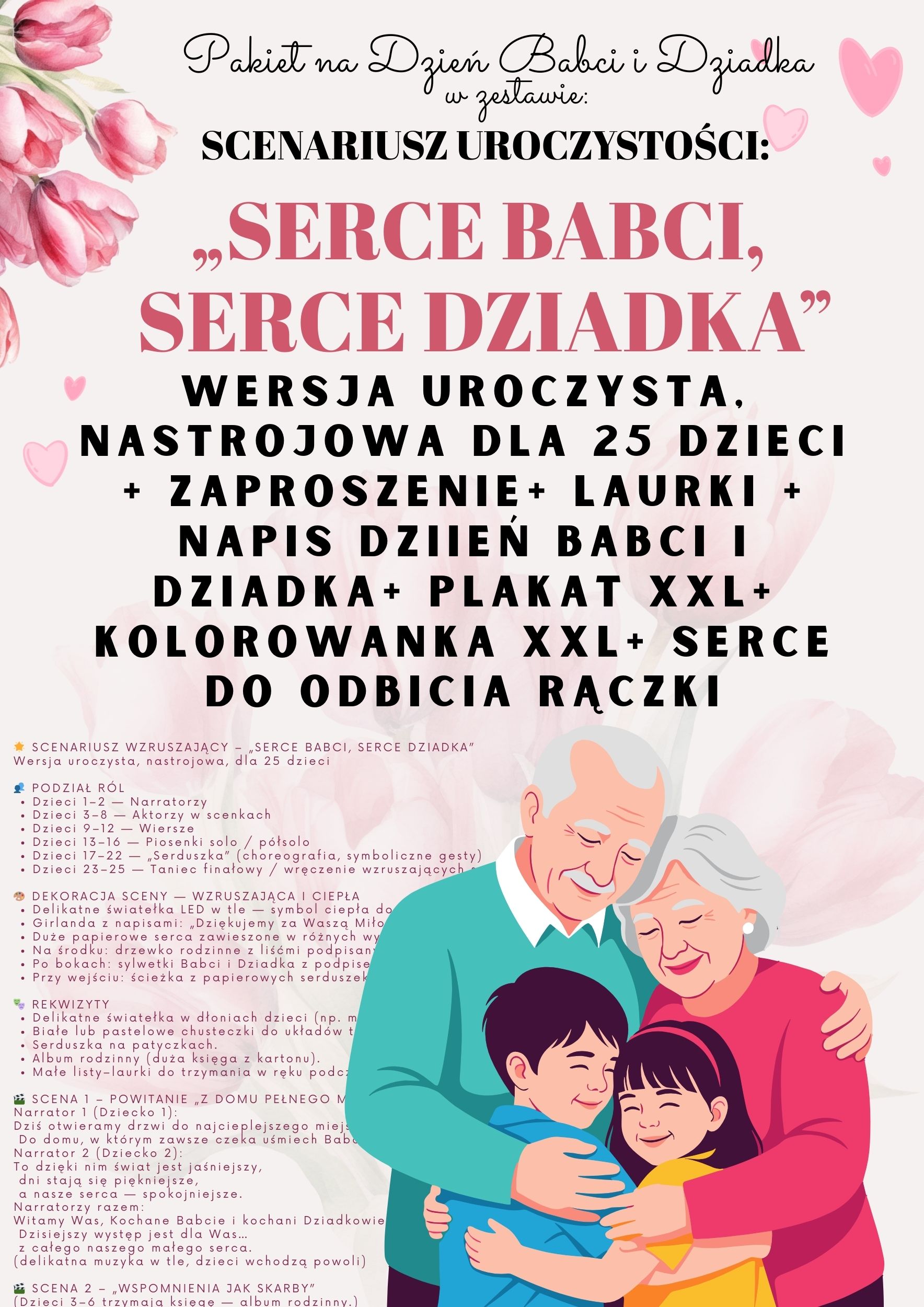 SCENARIUSZ UROCZYSTOŚCI:„SERCE BABCI, SERCE DZIADKA” Wersja uroczysta, nastrojowa, dla 25 dzieci + ZAPROSZENIE+ LAURKI + NAPIS+ PLAKAT XXL+ KOLOROWANKA XXL+ SERCE DO ODBICIA RĄCZKI