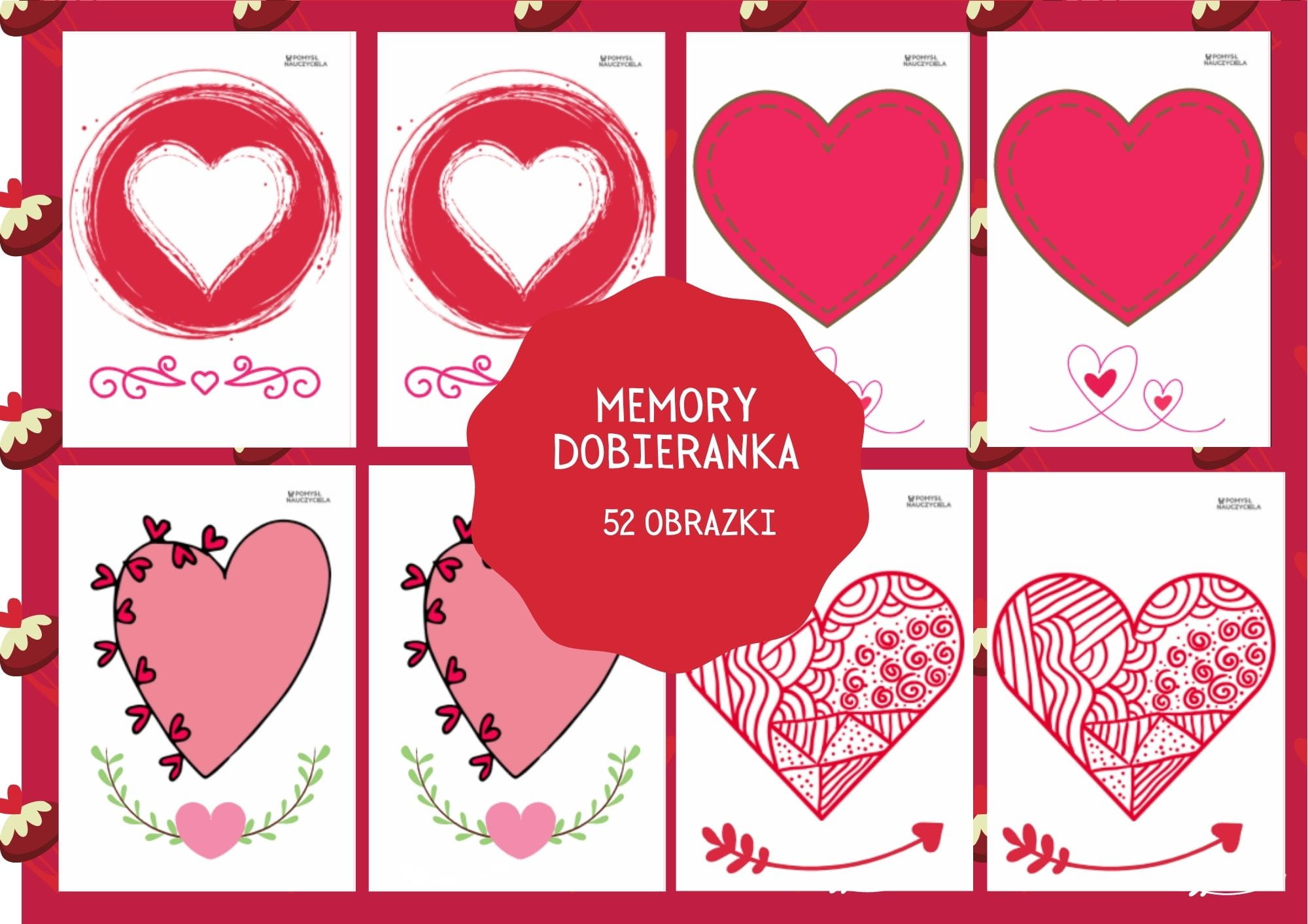 Gra memory to edukacyjna gra polegająca na odkrywaniu, zapamiętywaniu oraz łączeniu w pary tych samych elementów. Trenuje u dziecka pamięć, myślenie oraz spostrzegawczość. Gra zawiera obrazki związane tematycznie z Walentynkami, Dniem Przyjaźni, Dniem Mamy i Taty, Dniem Babci i Dziadka. Zapewnia dzieciom wyśmienitą zabawę. Można ją realizować podczas zajęć z całą grupą lub w grach zespołowych.
