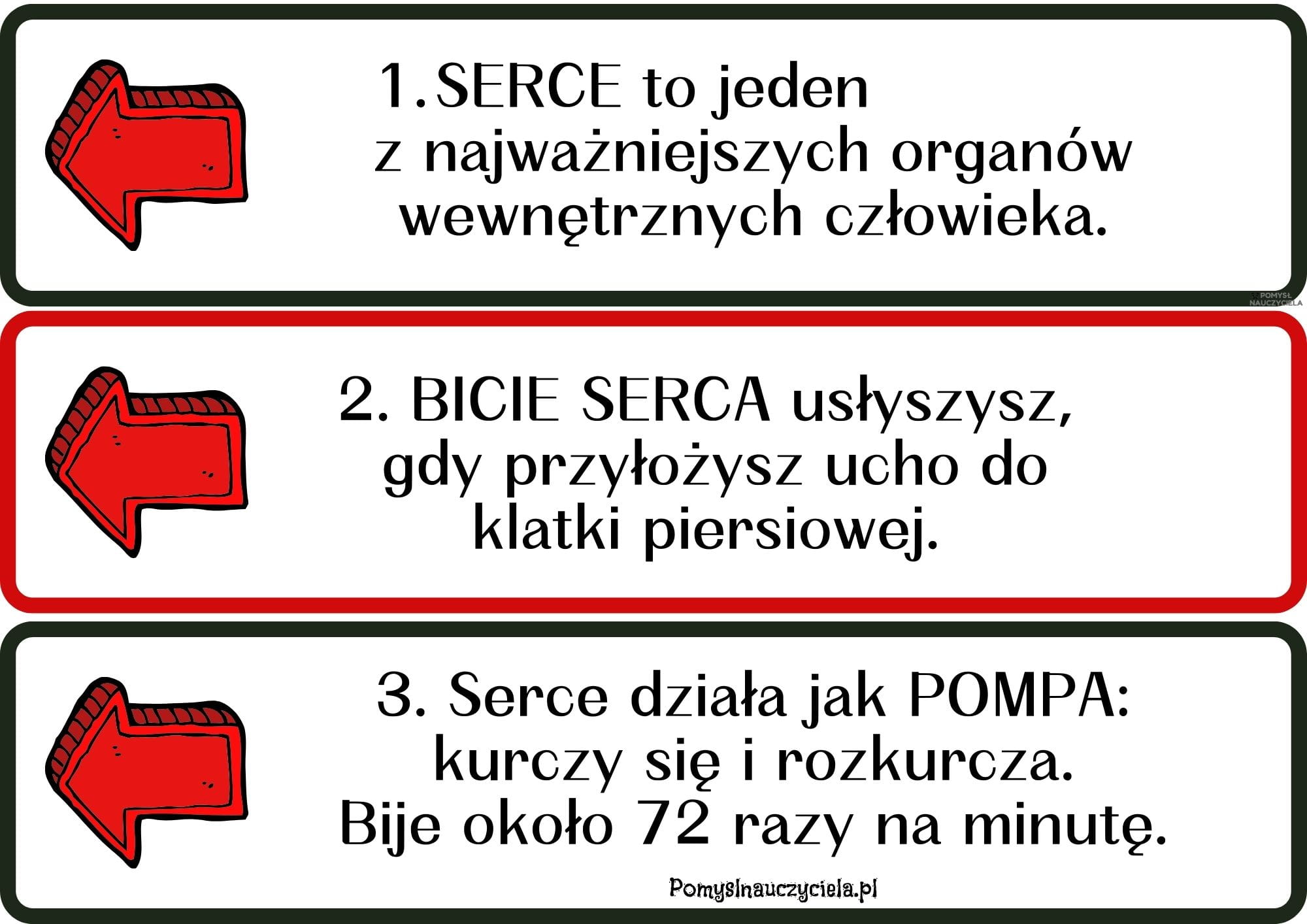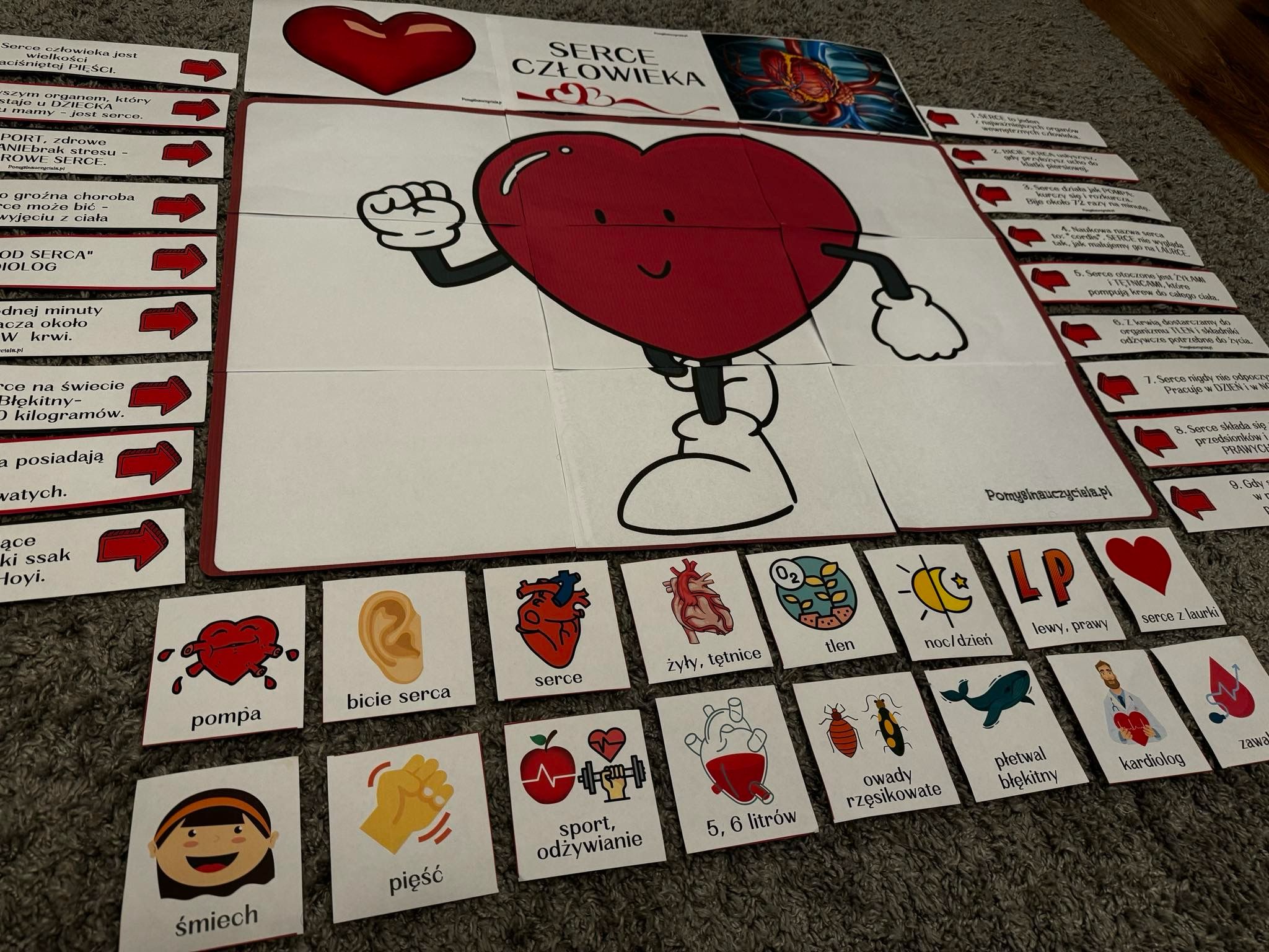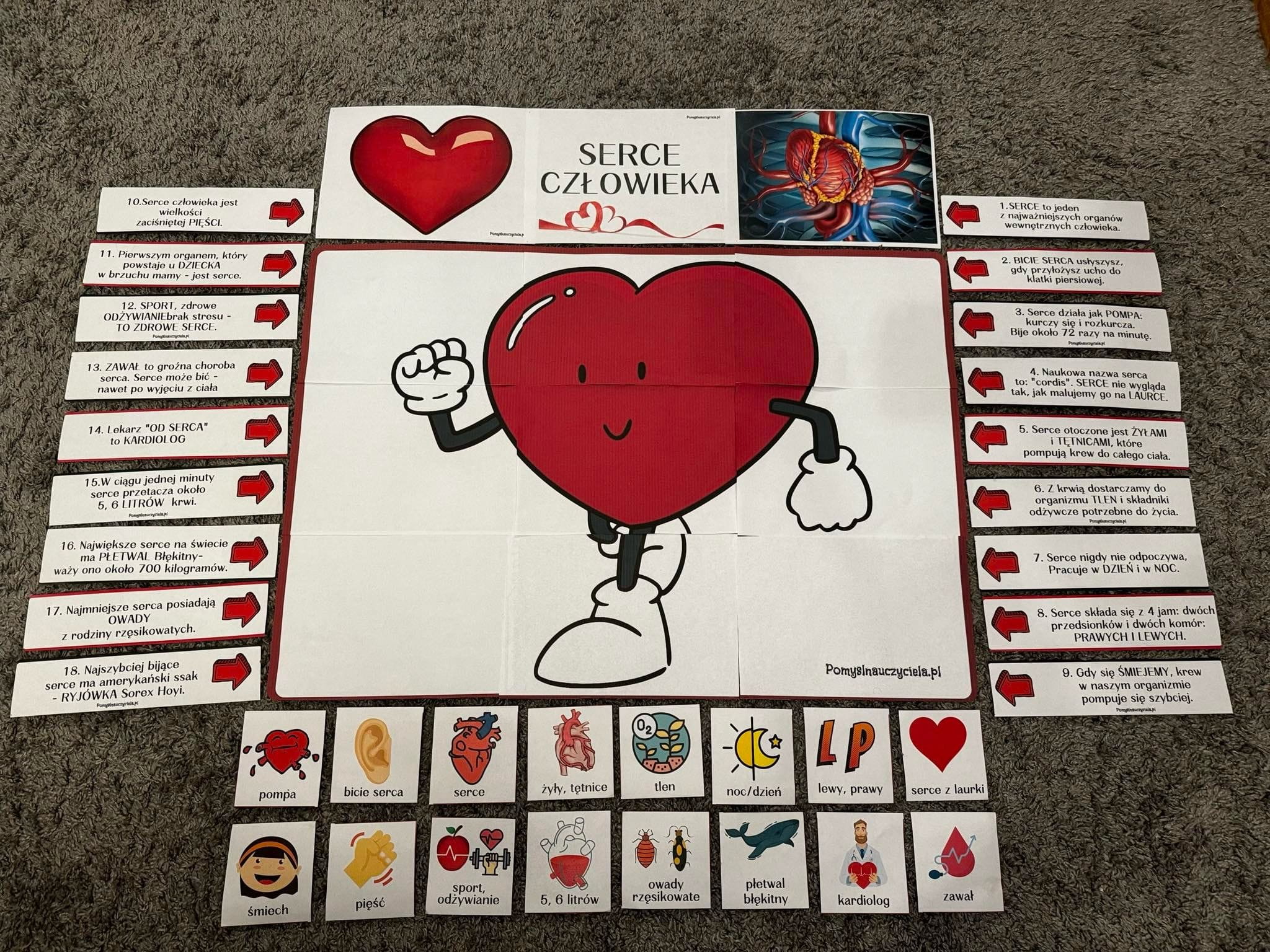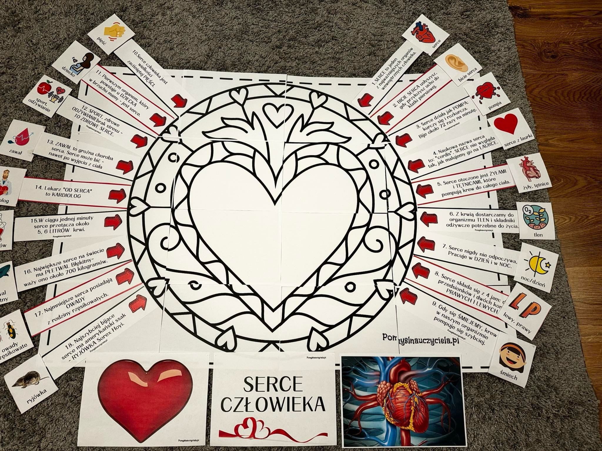 Pomoce zostały przygotowane w celu poszerzenia wiedzy dzieci na temat serca. Pakiet pozwala na stworzenie plakatu edukacyjnego sprawdzającego wiedzę dzieci w tym zakresie. Zestaw posiada 18 ciekawostek na temat serca w formie strzałek informacyjnych. Dzieci otrzymują dodatkowo 18 obrazków kontrolnych na podstawie których mogą zweryfikować poznaną na zajęciach wiedzę. Materiały można również zalaminować, aby dłużej się nimi cieszyć. W trakcie zajęć dzieci poznają również różnice między rzeczywistym obrazem serca, a tym bajkowym. Działania te rozwijają umiejętności zgodnej współpracy w zespole i stwarzają okazję do kreatywnych działań w celu utrwalenia wiedzy o sercu. Wspomaga to również rozwój mowy i słownictwa dziecka.