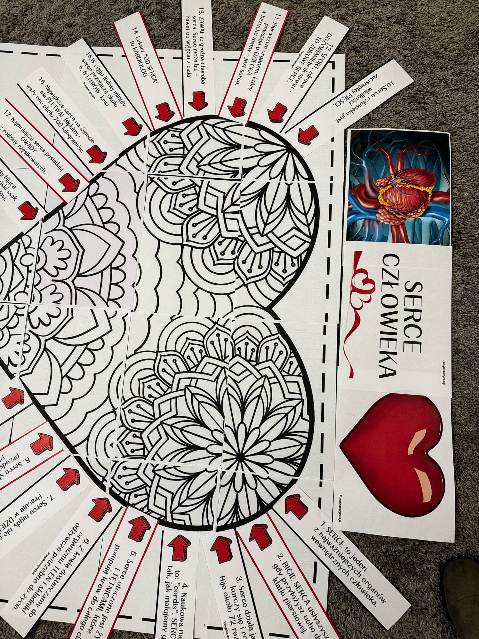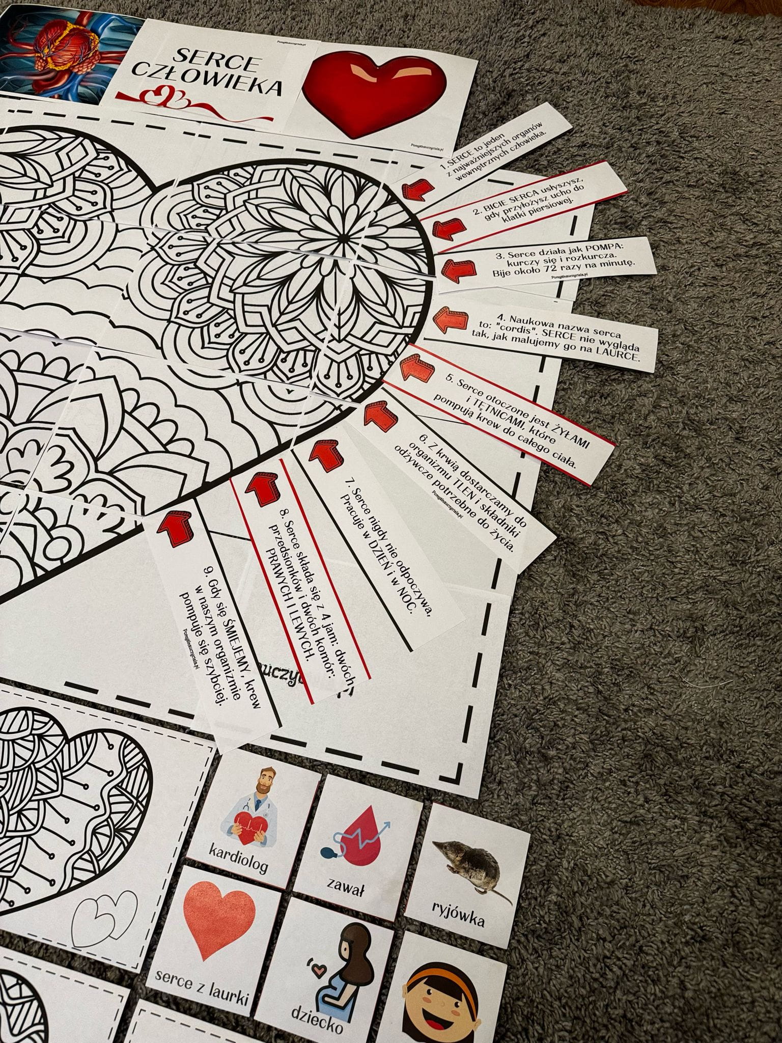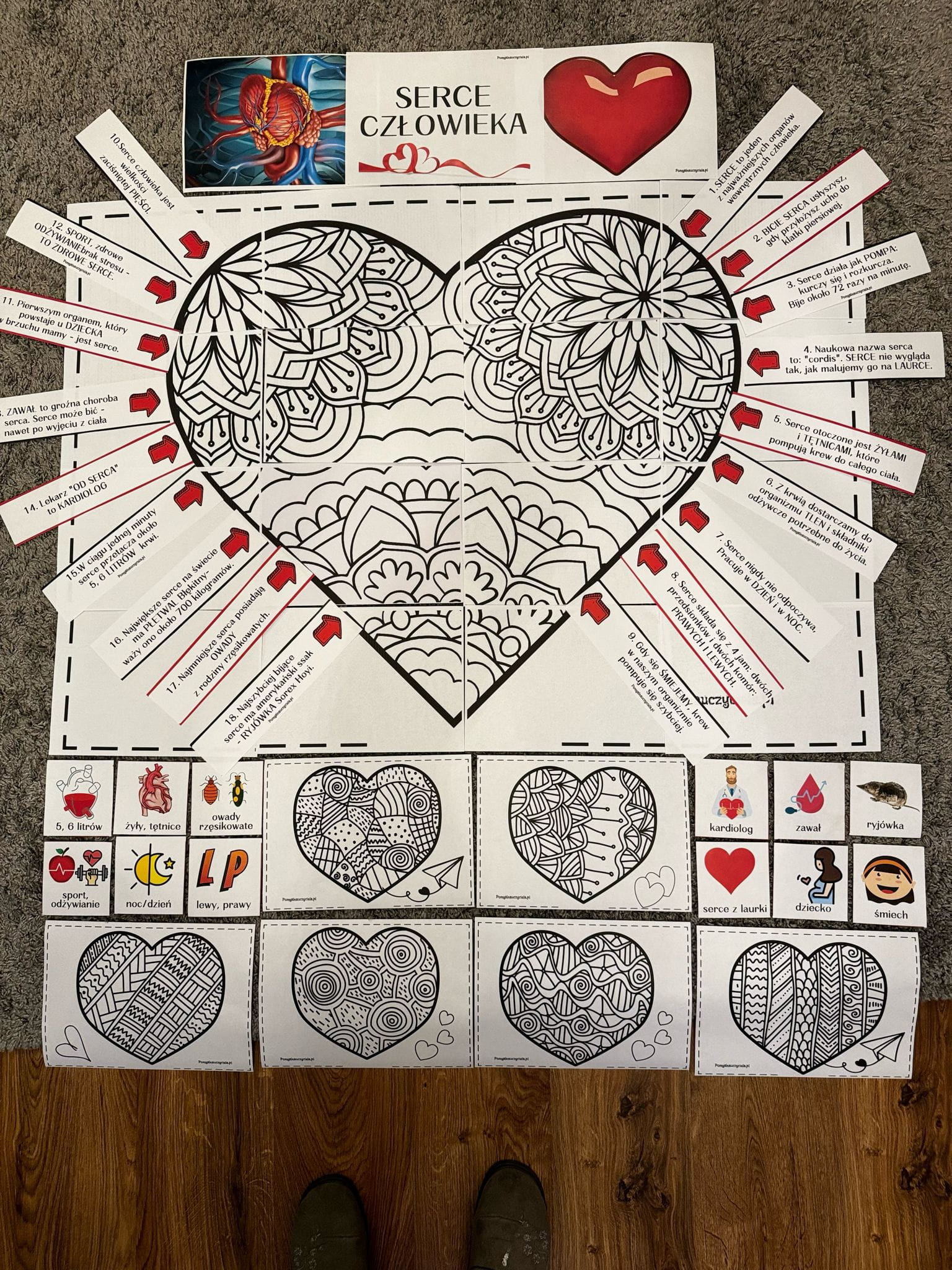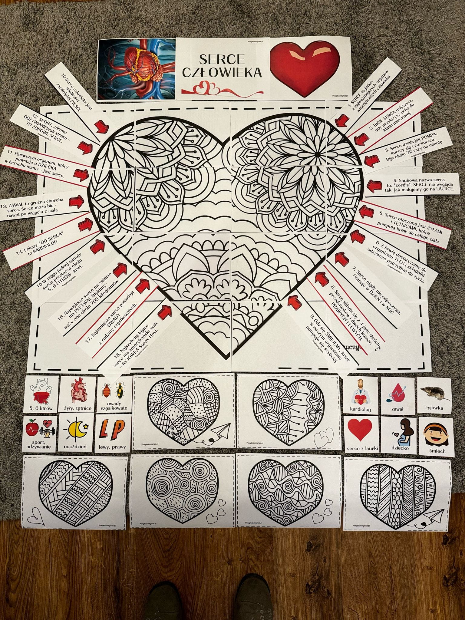 Pomoce zostały przygotowane w celu poszerzenia wiedzy dzieci na temat serca. Pakiet pozwala na stworzenie plakatu edukacyjnego sprawdzającego wiedzę dzieci w tym zakresie. Zestaw posiada 18 ciekawostek na temat serca w formie strzałek informacyjnych. Dzieci otrzymują dodatkowo 18 obrazków kontrolnych na podstawie których mogą zweryfikować poznaną na zajęciach wiedzę. Materiały można również zalaminować, aby dłużej się nimi cieszyć. W trakcie zajęć dzieci poznają również różnice między rzeczywistym obrazem serca, a tym bajkowym. Działania te rozwijają umiejętności zgodnej współpracy w zespole i stwarzają okazję do kreatywnych działań w celu utrwalenia wiedzy o sercu. Wspomaga to również rozwój mowy i słownictwa dziecka.