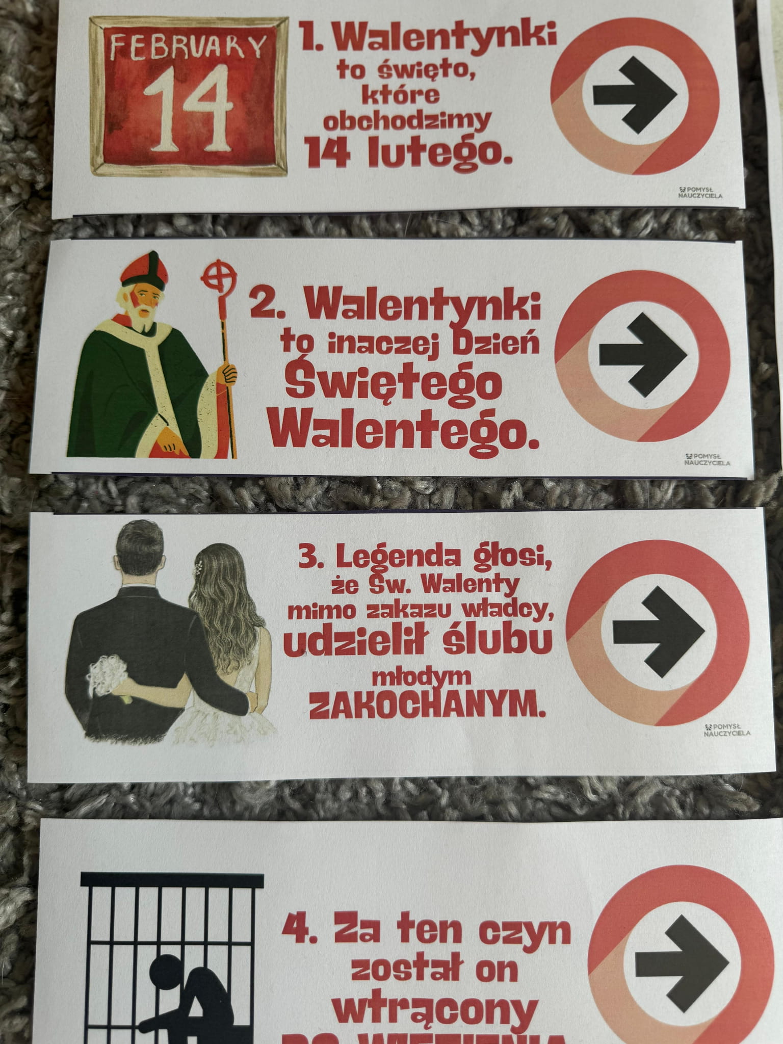 Zestaw zawiera 27 ciekawostek o walentynkach "WALENTYNKI - co o nim wiesz?". Dzieci mają za zadanie wysłuchać informacji o karnawale, a następnie przyporządkować odpowiednią informację o karnawale do właściwej karty kontrolnej. Działania te rozwijają umiejętności zgodnej współpracy w zespole i stwarza okazję do kreatywnych działań w celu utrwalenia wiedzy o karnawale. Wspomaga to również rozwój mowy i słownictwa dziecka. Następnie proponujemy dzieciom zabawę w kalambury, lub stworzenie plakatu o karnawale z wykorzystaniem pasków informacyjnych które należy wyciąć i przykleić na plakat. Strzałki mogą być skierowane w stronę napisu KARNAWAŁ, który znajduje się w naszej ofercie.