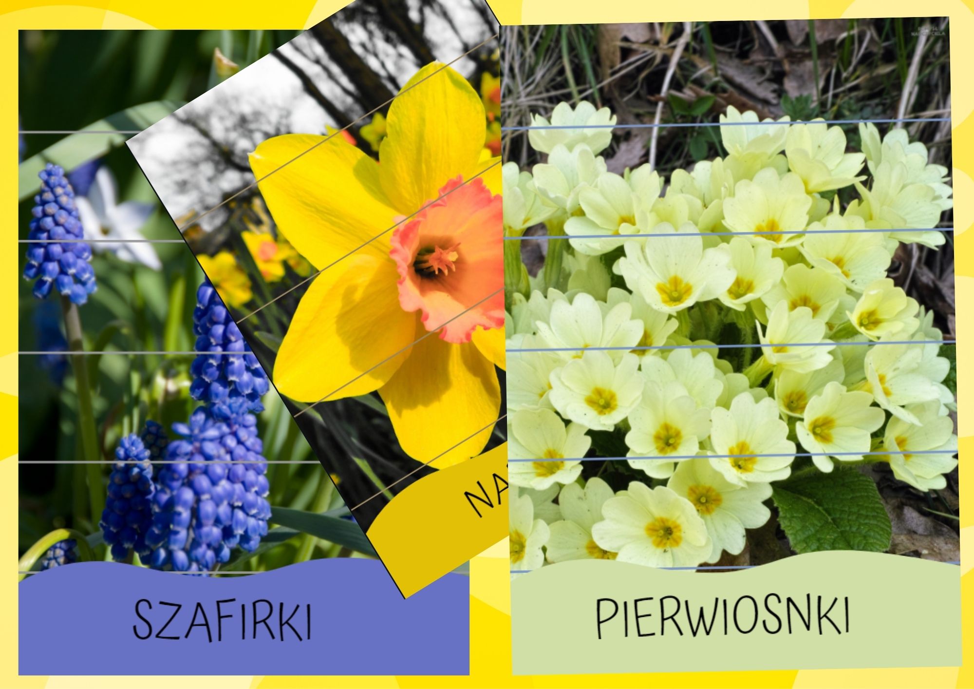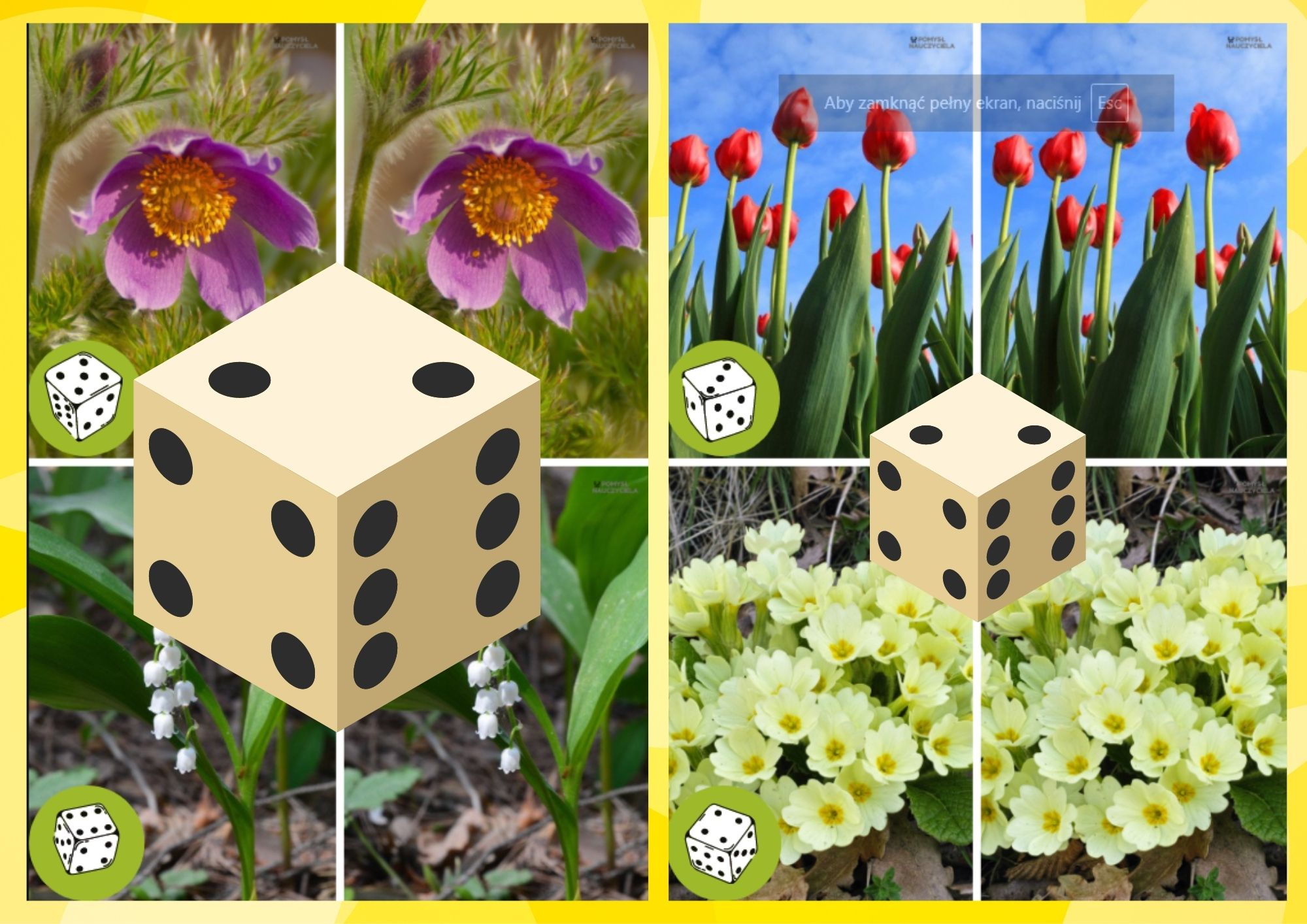 Po zapoznaniu dzieci z nazwami kwiatów zakwitających na wiosnę poprzez ułożenie puzzli kwiatowych z napisami, lub wykorzystanie tych kart jako plansze informacyjne. Obrazki z kwiatami i z narysowana kostką układamy na dywanie w rozsypce. Celem utrwalenia nazw kwiatów wybrane dziecko rzuca kostką a następnie sprawdza, na której karcie znajduje się wyrzucona liczba oczek, łączy obrazki w parę i podaje nazwę kwiatka. Następnie kostką rzuca kolejne dziecko.