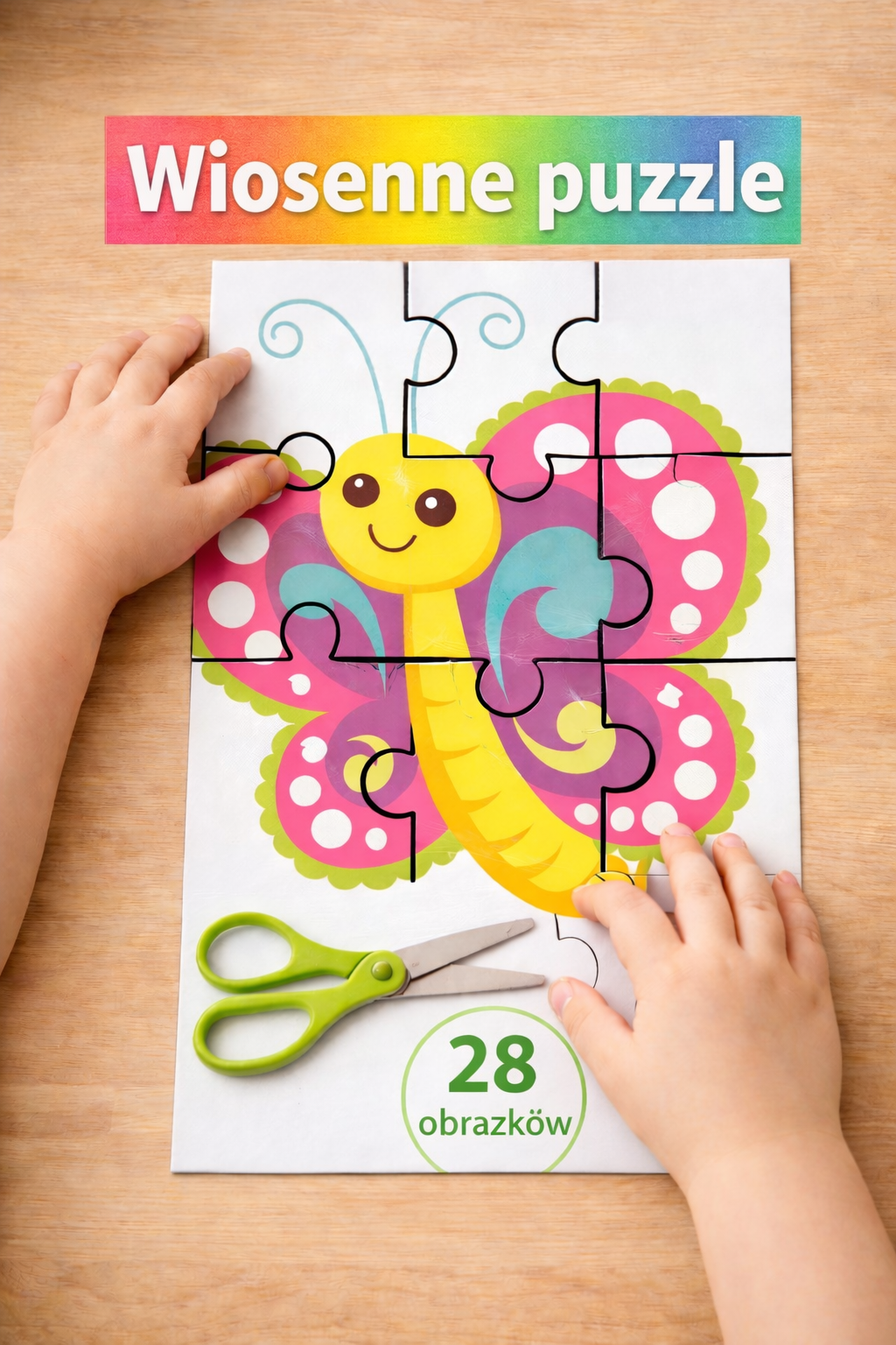 Zadaniem dzieci jest wycięcie wszystkich puzzli, poukładanie na kartce i przyklejenie.