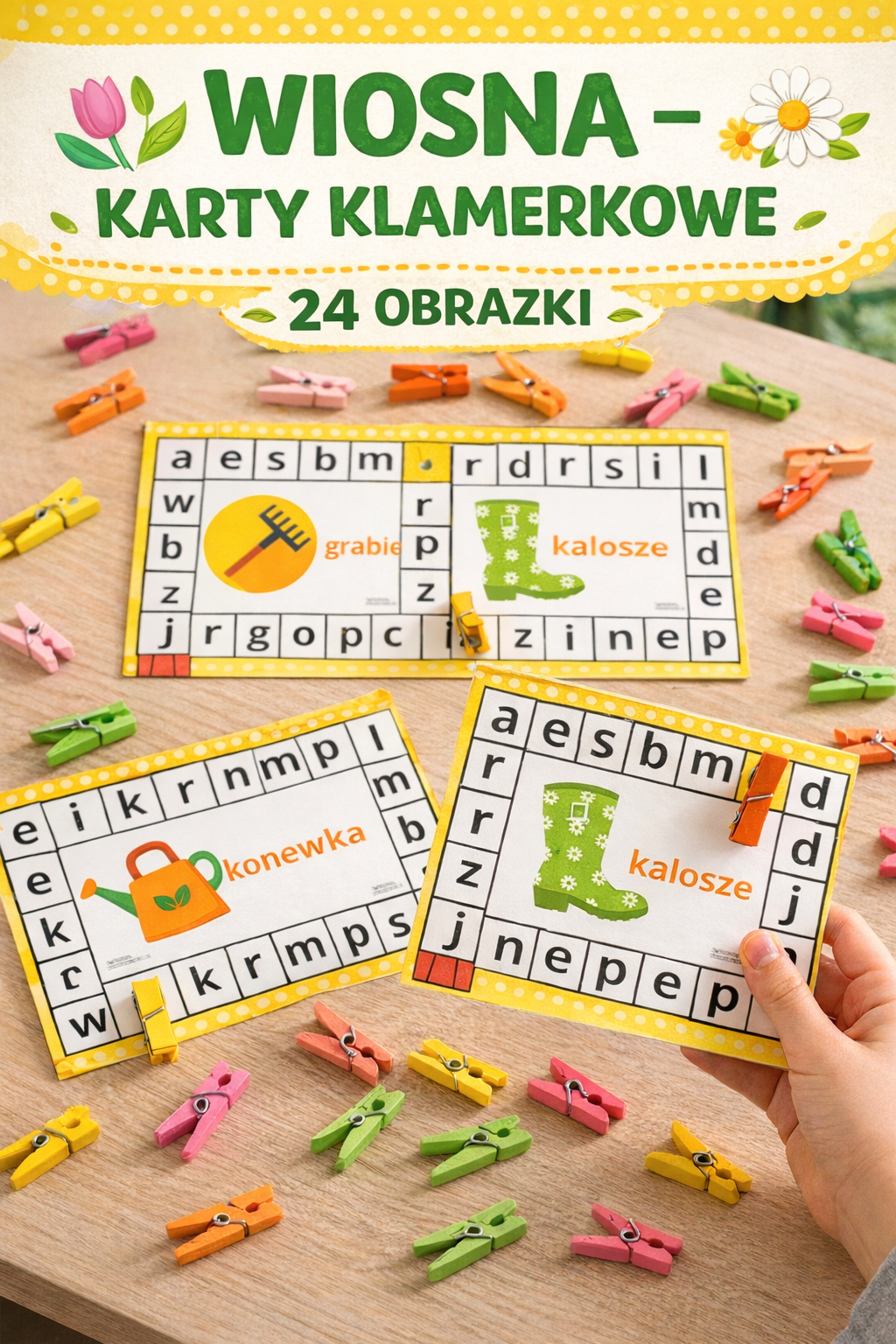 Karty klamerkowe to pomoc edukacyjna zawierająca 24 plansze tematycznie związane z narzędziami ogrodniczymi. Zadanie polega na zaznaczeniu klamerką lub markerem suchościeralnym liter tworzących nazwę danego narzędzia ogrodniczego.