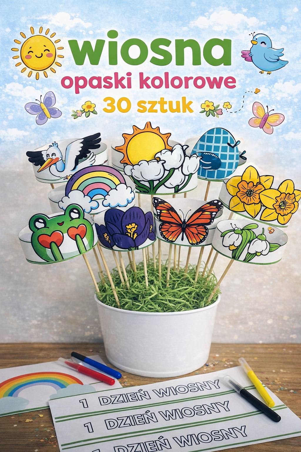 Dzieci mogą samodzielnie wycinać opaski. Na każdej opasce znajduje się napis, który dzieci mogą pokolorować. Opaski uatrakcyjnią przebieg zajęć wiosennych. Dodatkowo mogą zostać wykorzystane do organizacji pierwszego dnia wiosny.